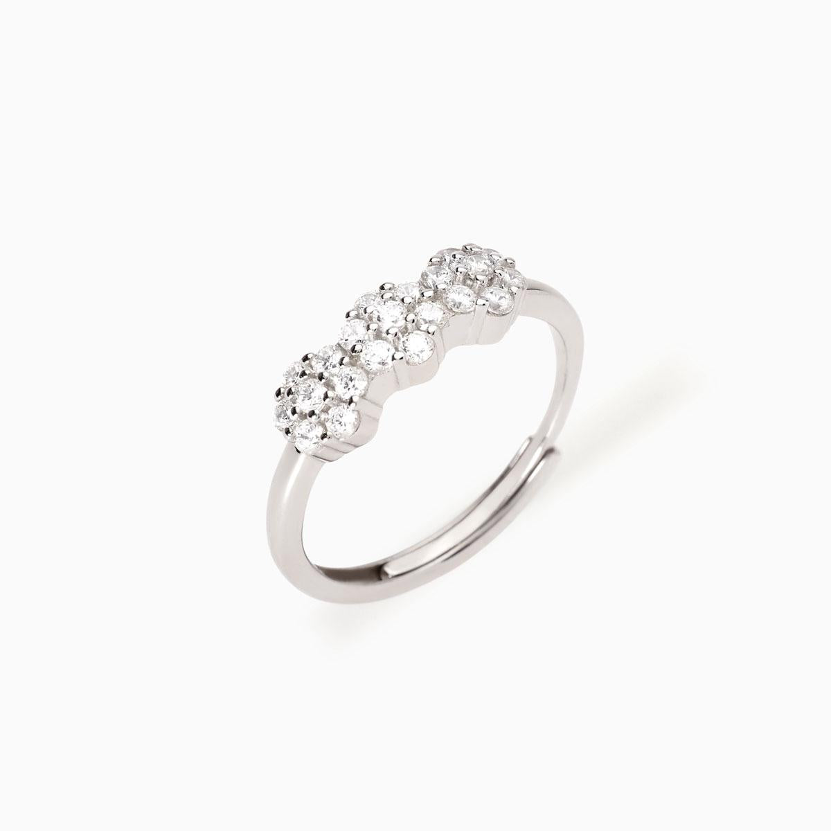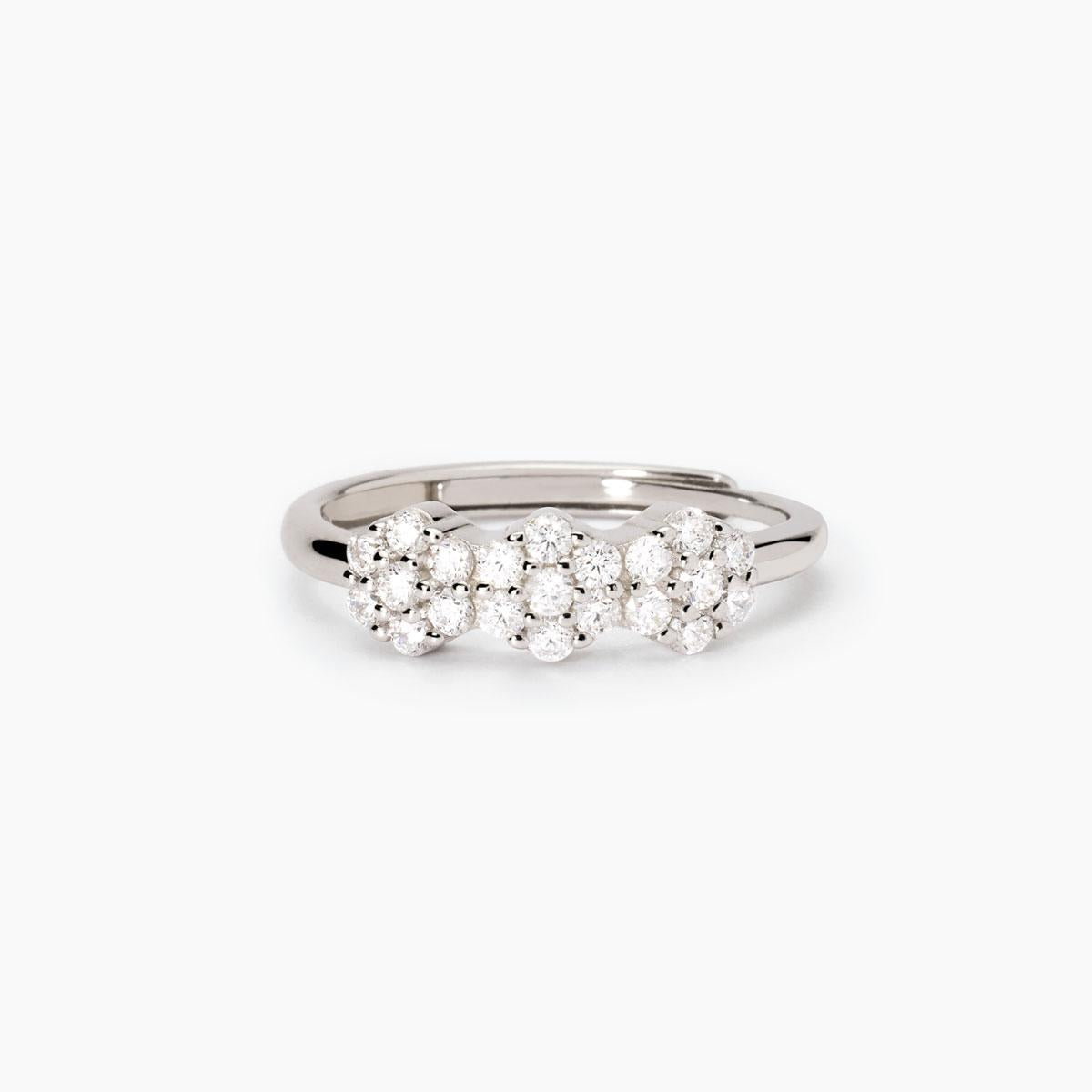 Anello regolabile da donna in argento rodiato con elementi a forma di fiore e zirconi.