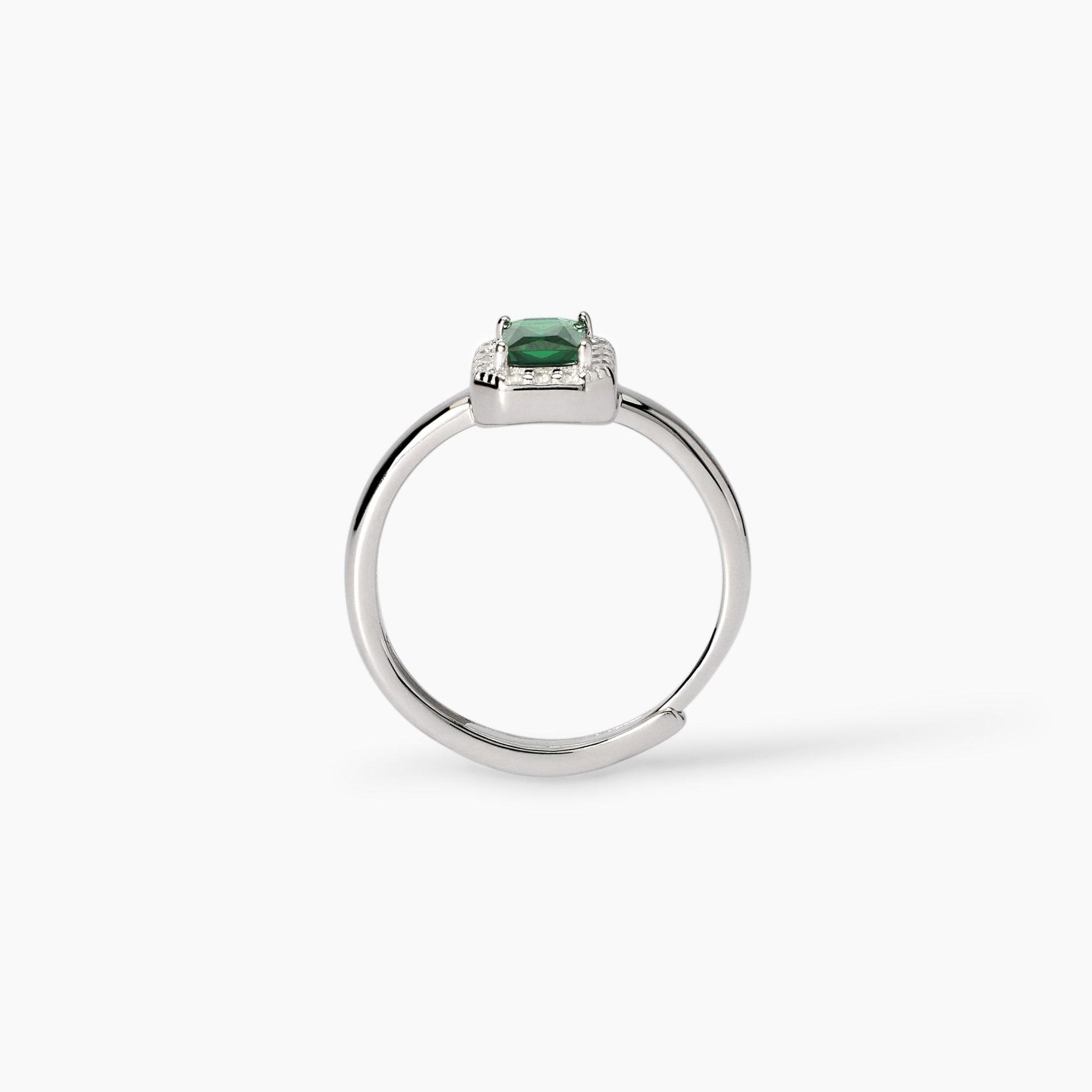Anello regolabile in argento con smeraldo sintetico taglio baguette e zirconi bianchi.