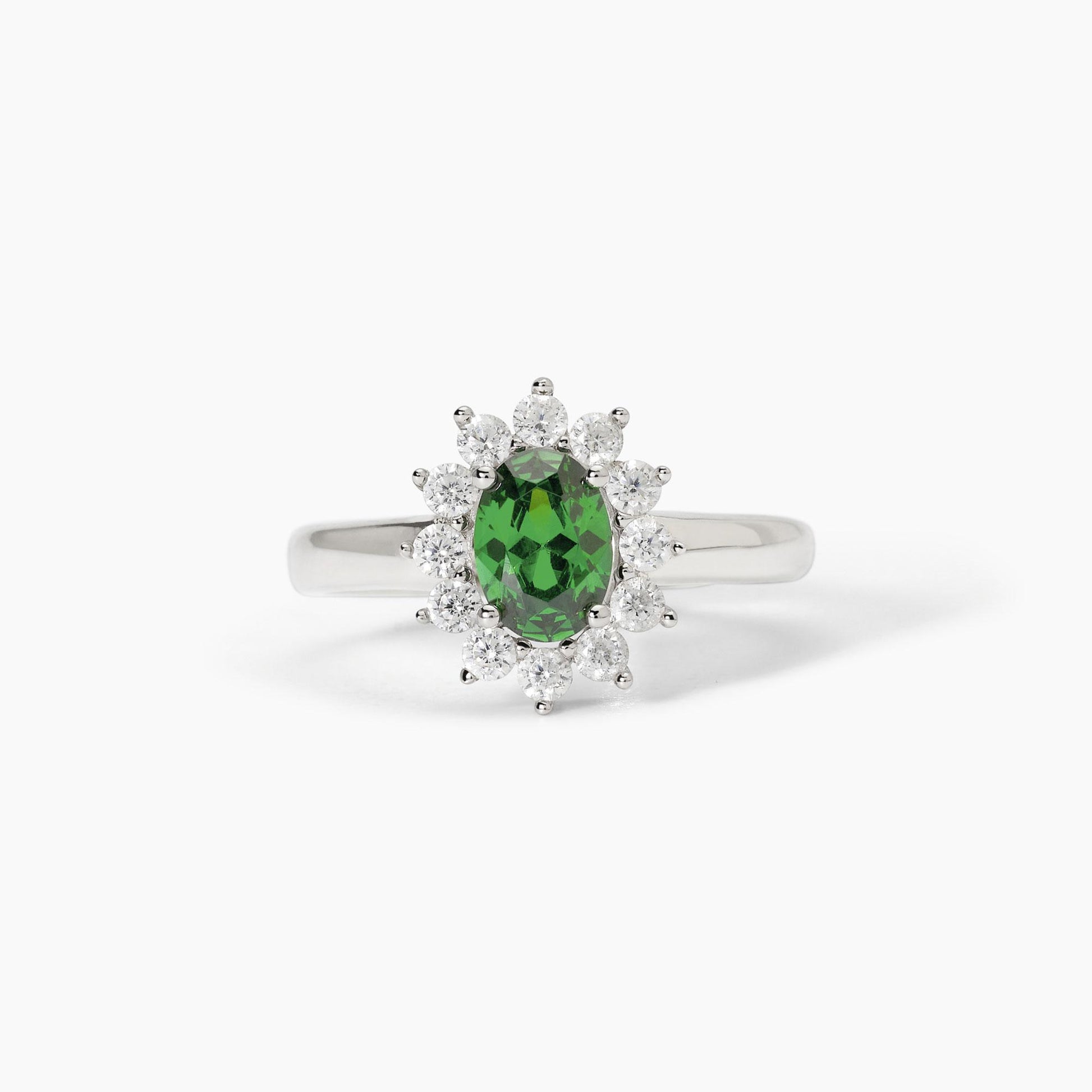 Anello da donna regolabile in argento rodiato con smeraldo/zaffiro sintetico taglio ovale e zirconi bianchi.
