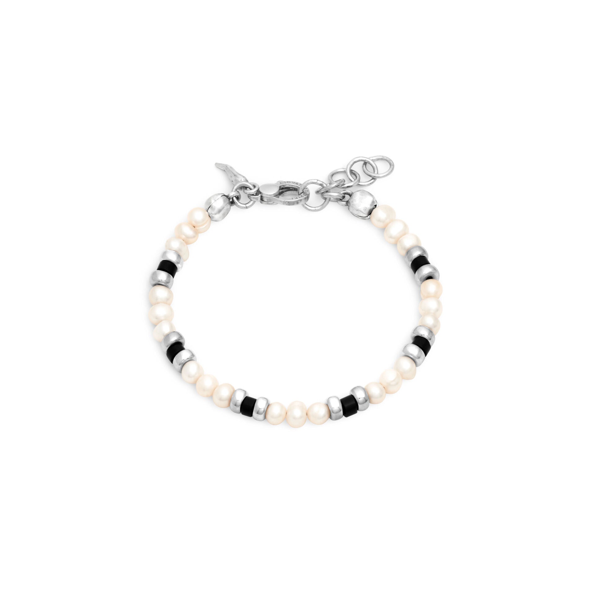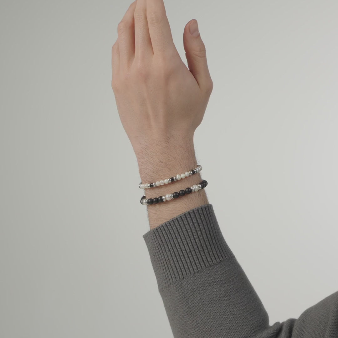 Un bracciale in argento dal design inedito, che combina perle naturali d'acqua dolce, ciambelline in argento e "barilotti" in agata nera opaca. L'effetto ottenuto è quello di un elegante contrasto di materiali. Fatto a mano in azienda.