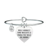 Bangle in acciaio con ciondolo satinato a forma di cuore con scritta "Negli abbracci sono nascoste le parole più belle del mondo".