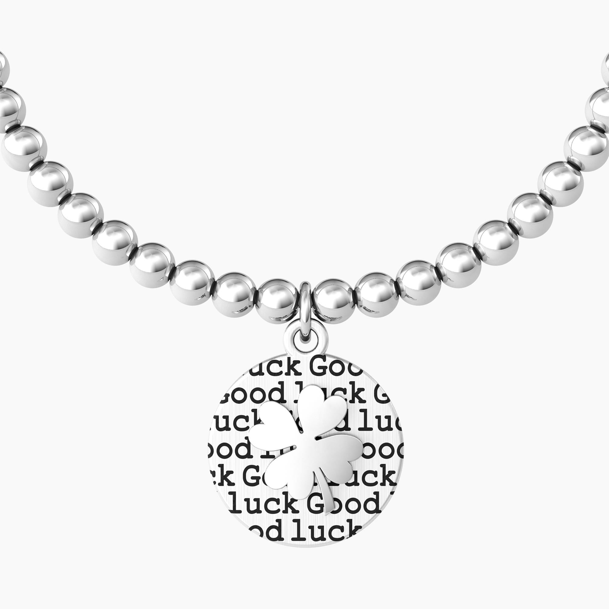 Bracciale elastico con sfere in acciaio e ciondolo satinato tondo con quadrifoglio in rilievo e cristallo.