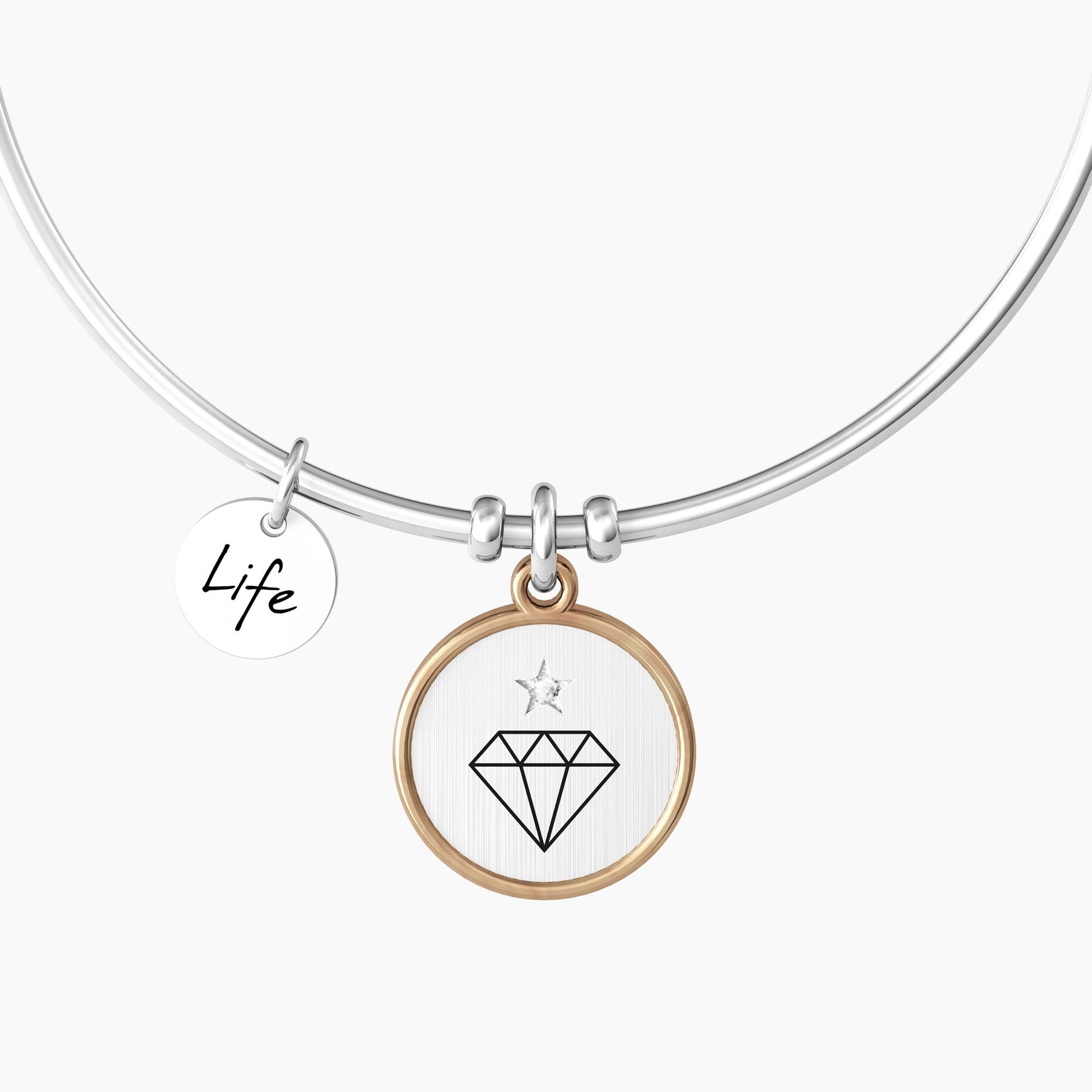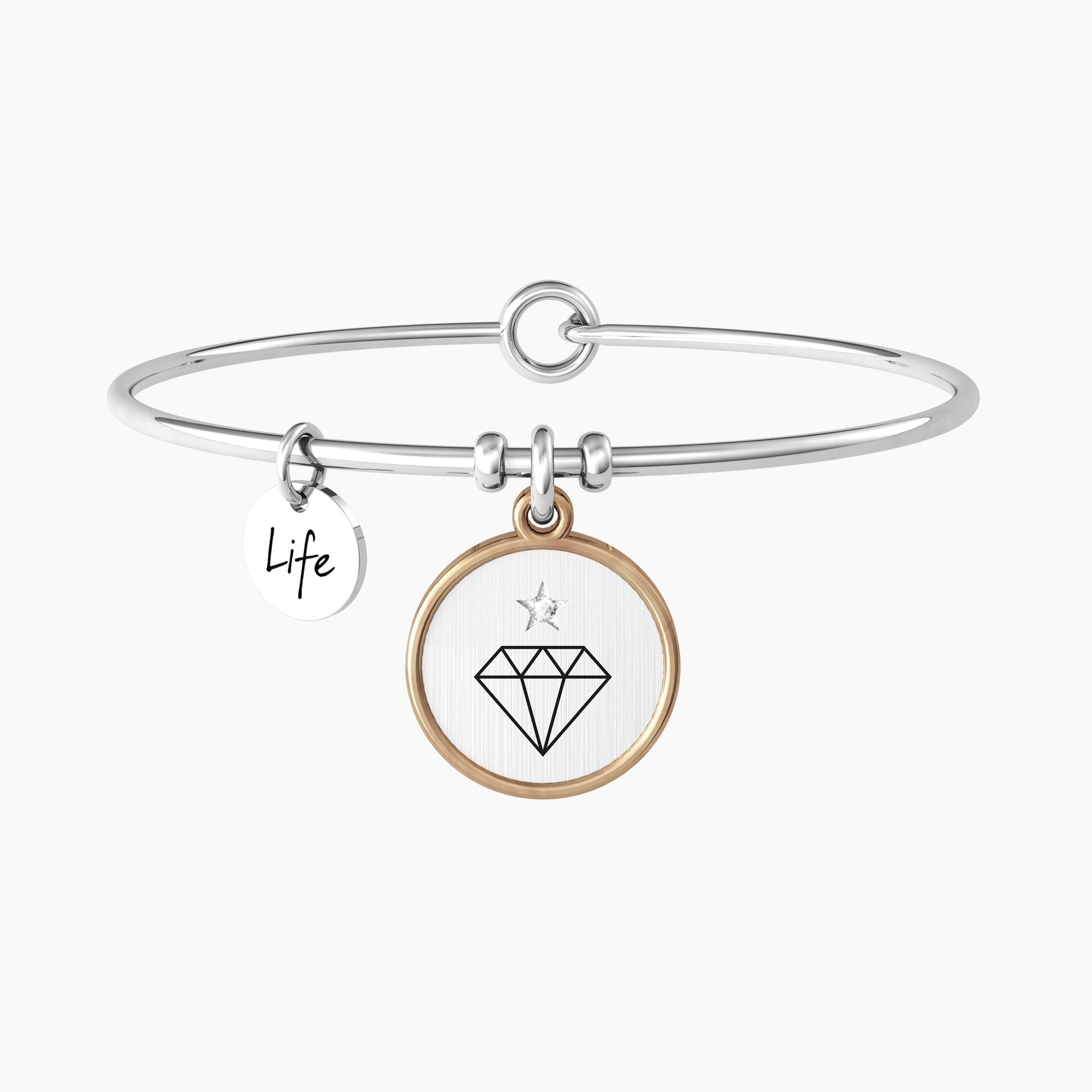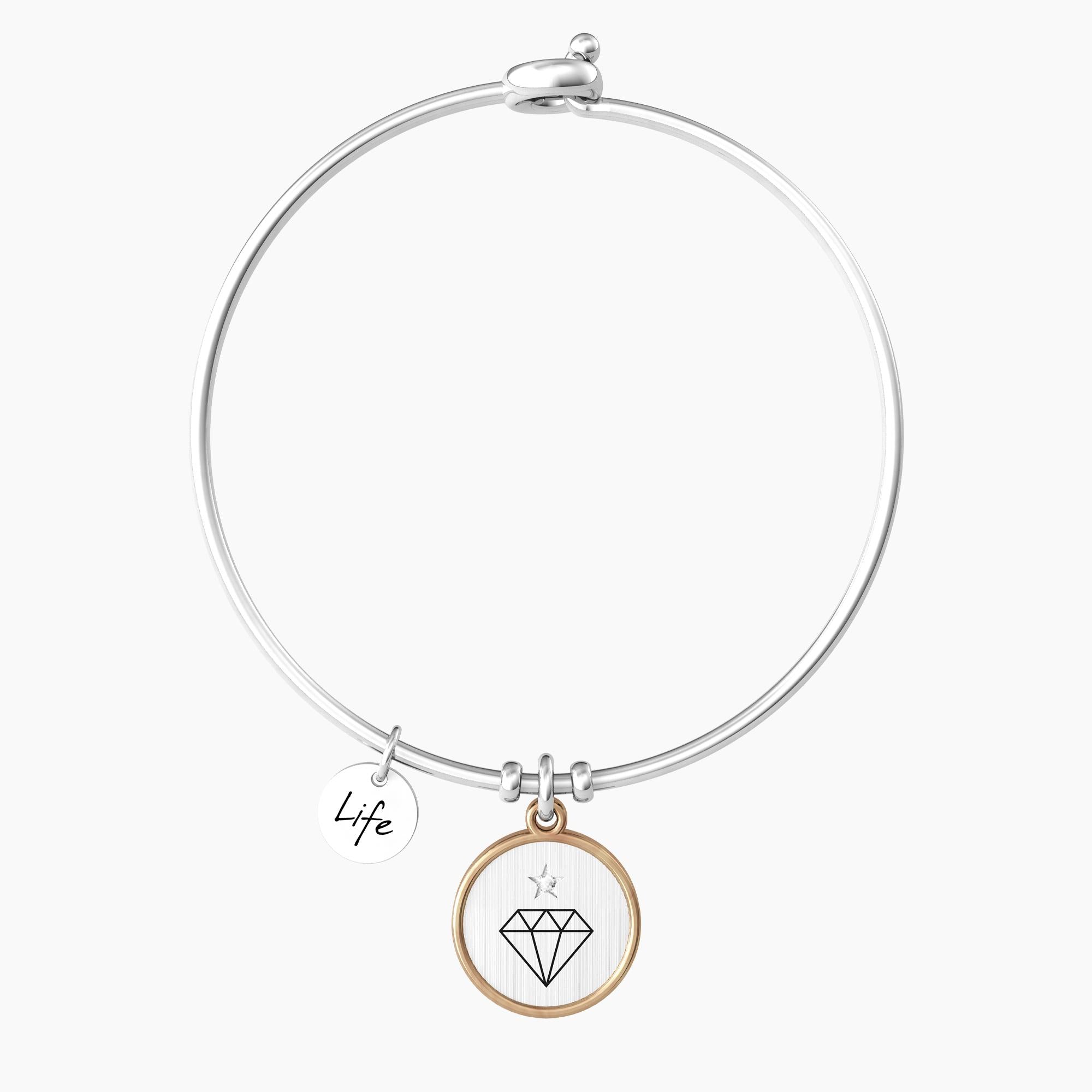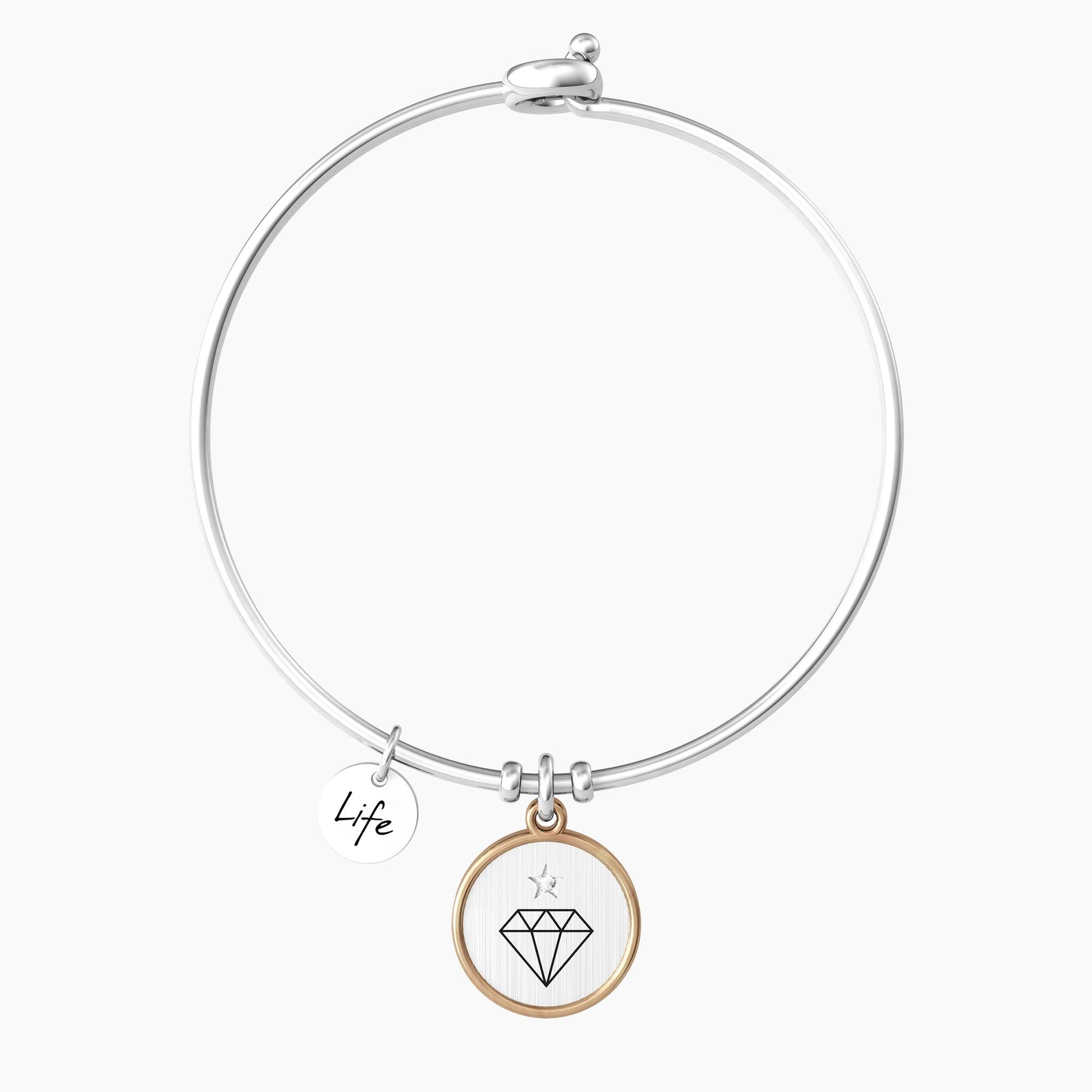 Bangle in acciaio con ciondolo rotondo satinato con bordo lucido rosé, cristallo bianco e frase "Who finds a friend finds a treasure".