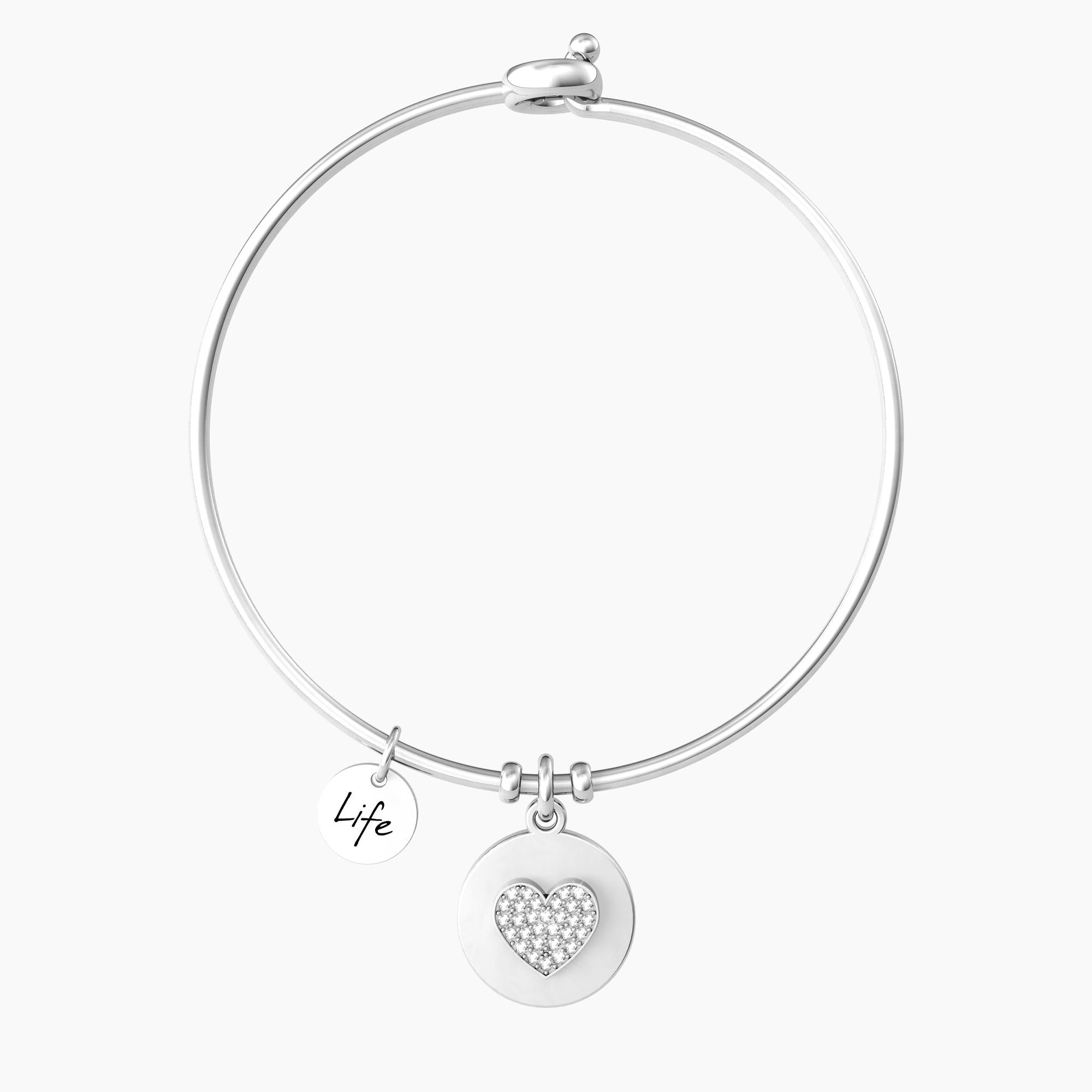 Bangle in acciaio con ciondolo tondo lucido con cuore, cristalli e scritta "Abbracci, dolcezza e amore, questa è la mia mamma".