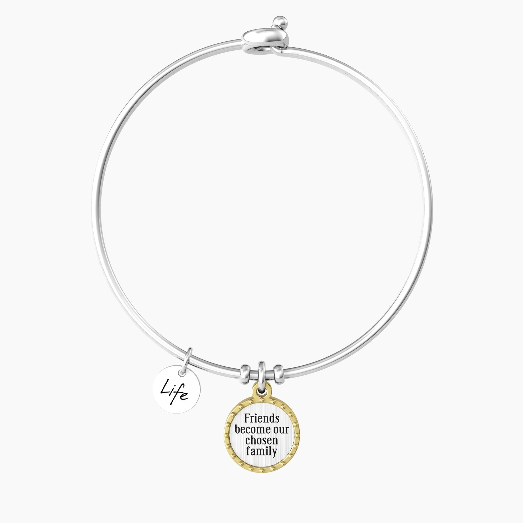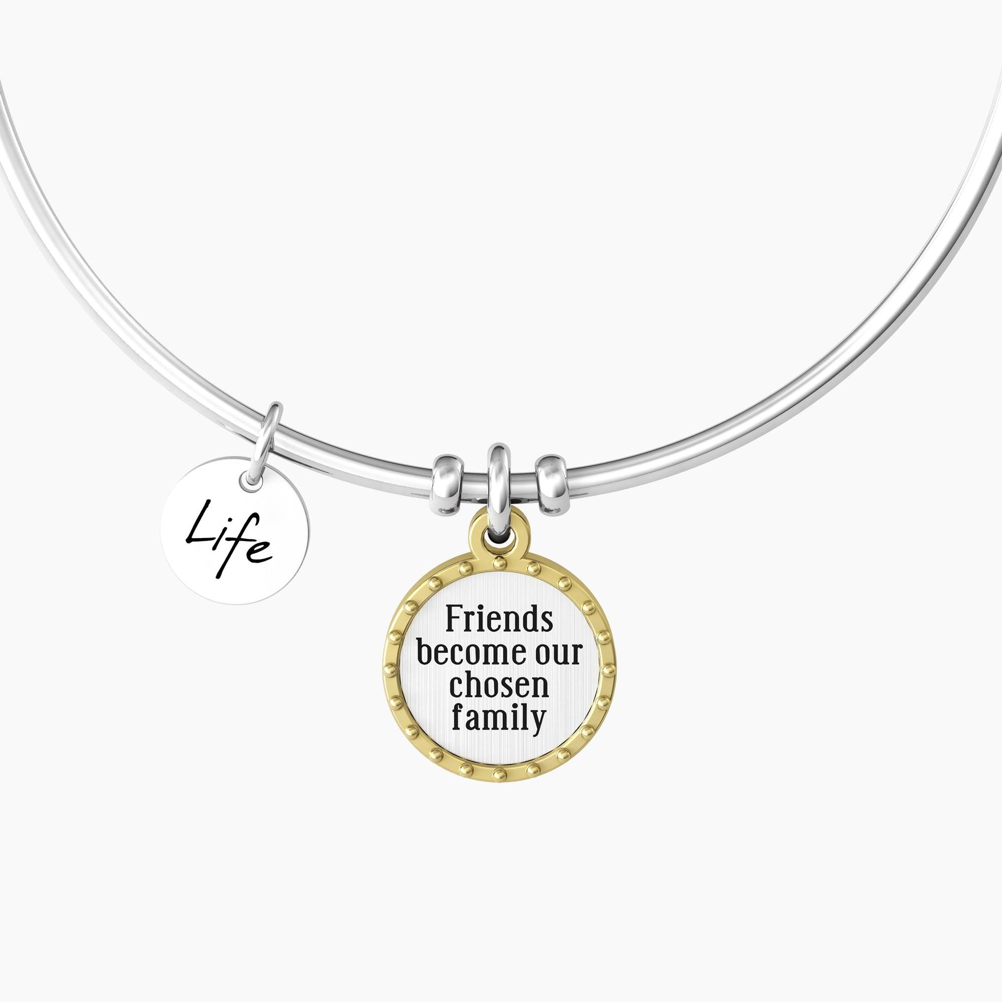 Bangle in acciaio con ciondolo rotondo con rifinitura borchiata color oro e frase "Friends become your chosen family" sul fronte. Punto luce a forma di stella sul retro. Chiusura del bracciale tonda.