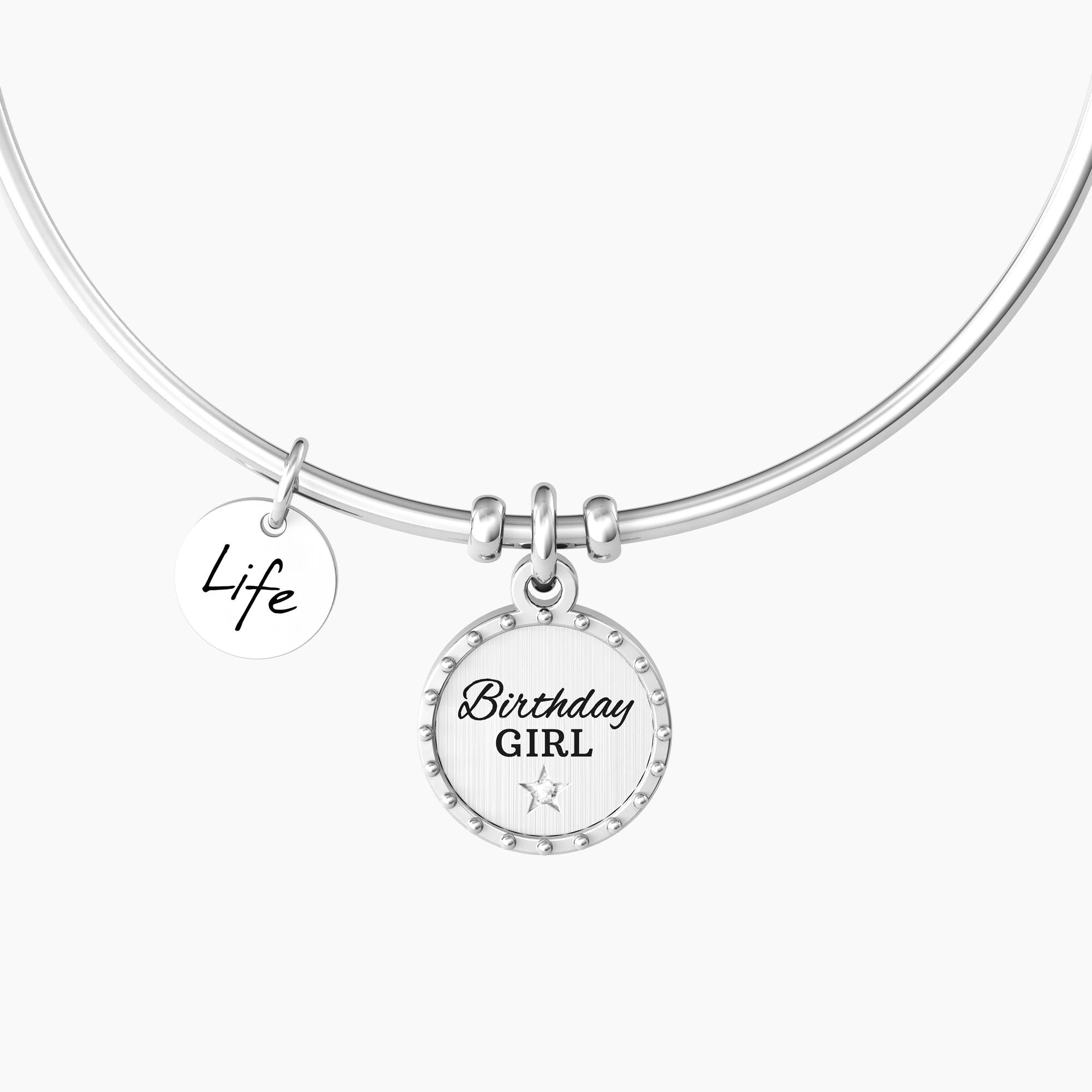 Bangle in acciaio con ciondolo tondo con rifinitura borchiata in rilievo. Incisione sul fronte "Birthday Girl" e punto luce. Chiusura tonda.