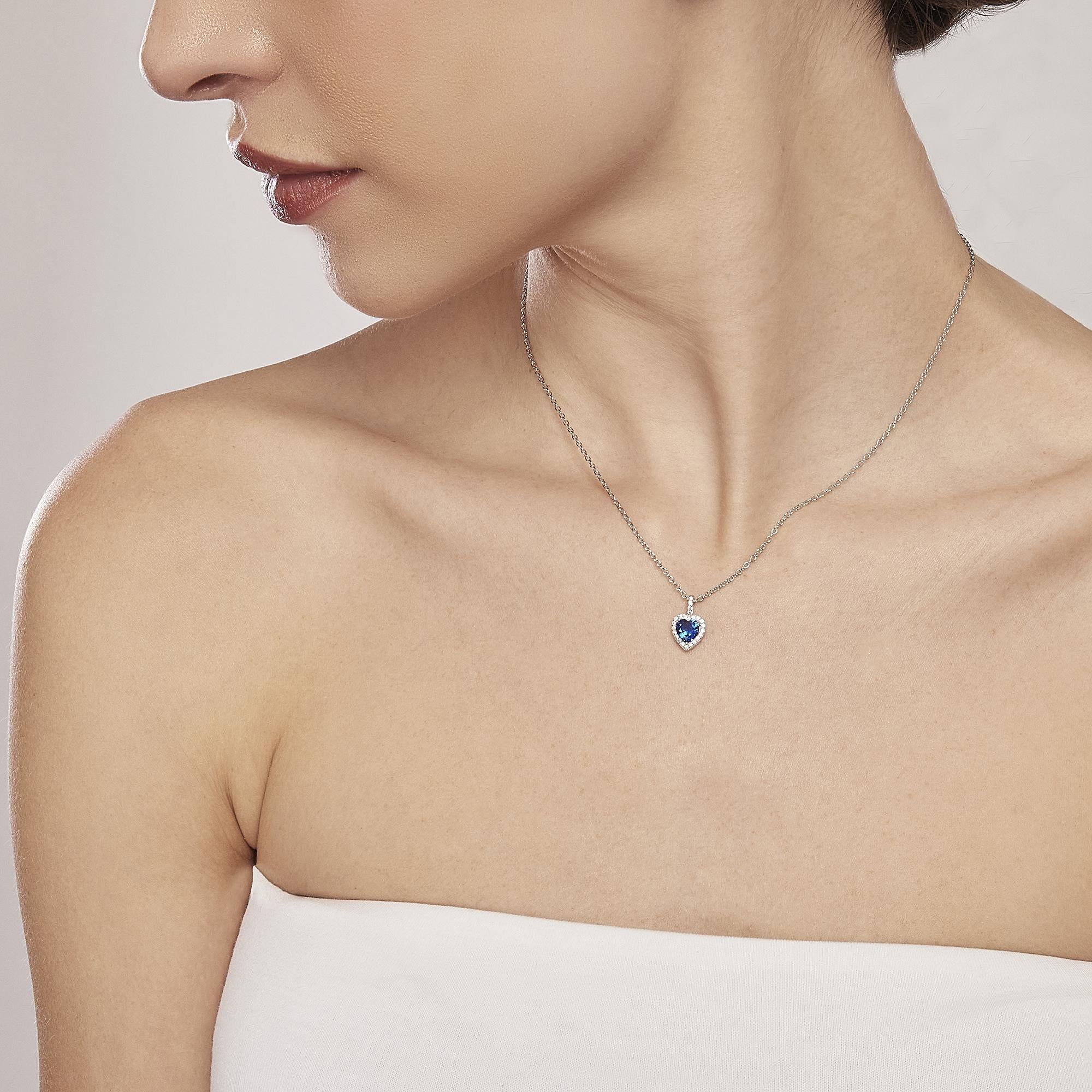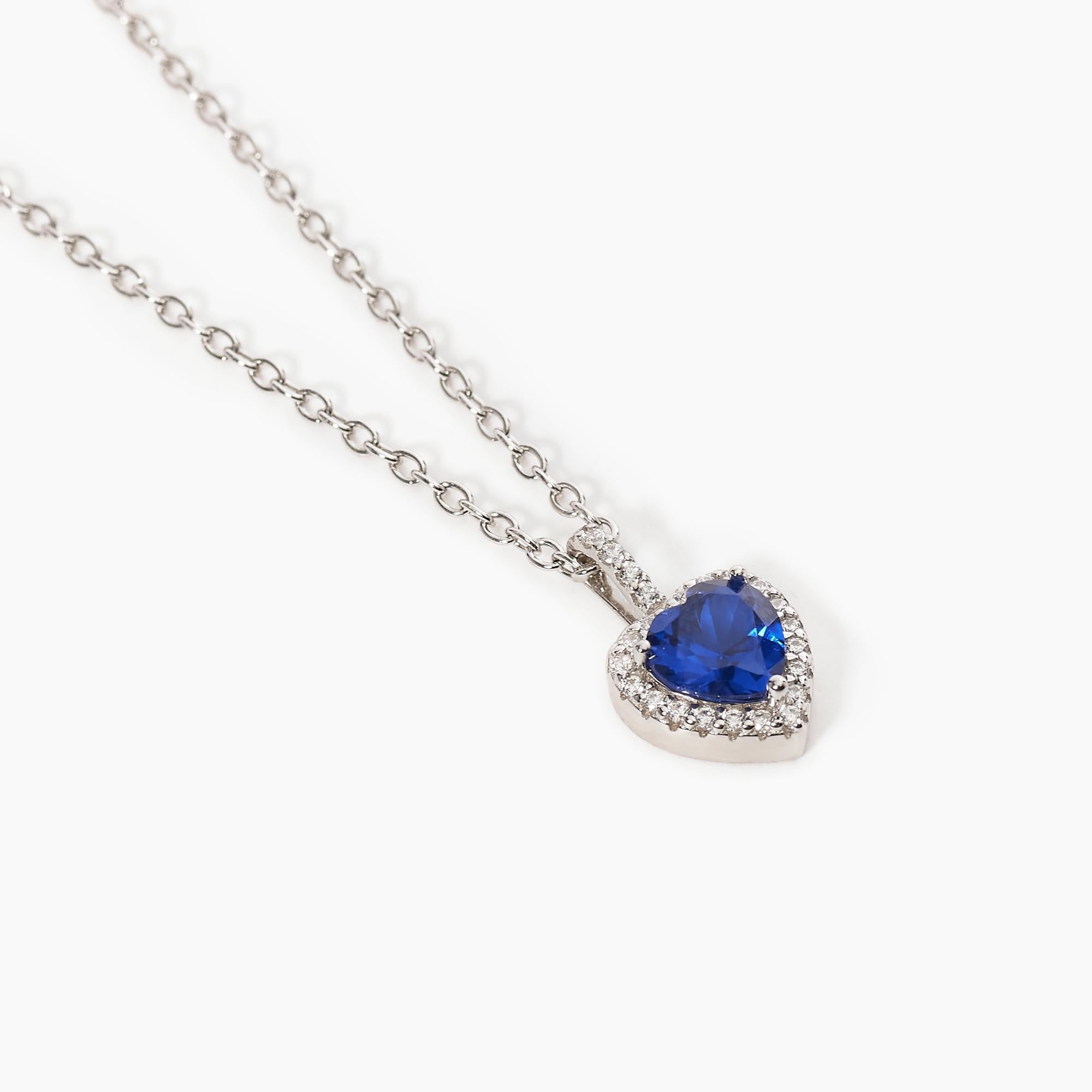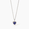 Collana in argento con zaffiro sintetico blu centrale a forma di cuore e zirconi.