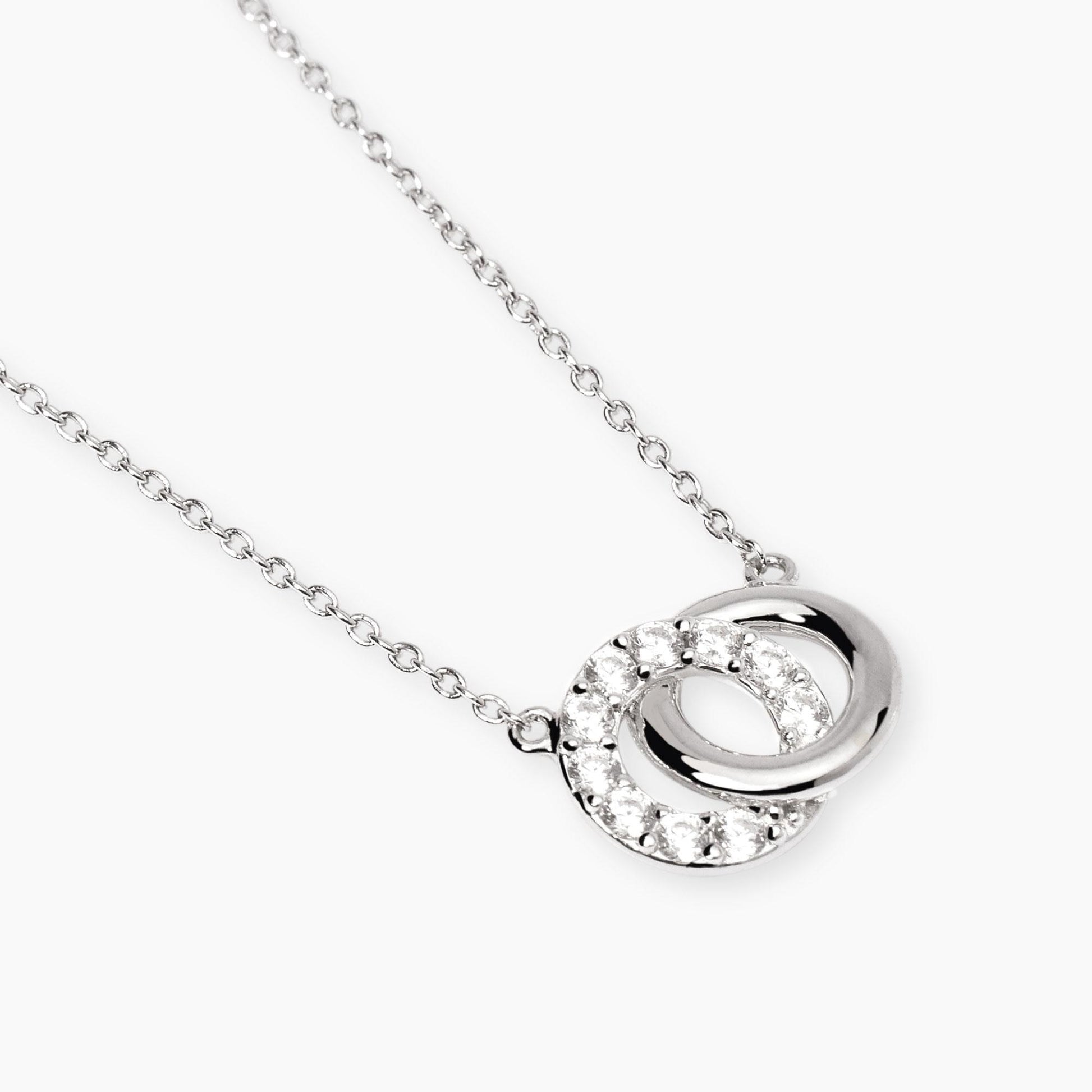 Girocollo in argento rodiato e zirconi con catena rolò e doppio cerchio.