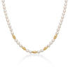 Le perle Oriente dalla forma allungata sono la firma della collezione. In questa collana, cinque elementi in argento dorato con effetto diamantato arricchiscono il gioiello e lo rendono ancora più luminoso.