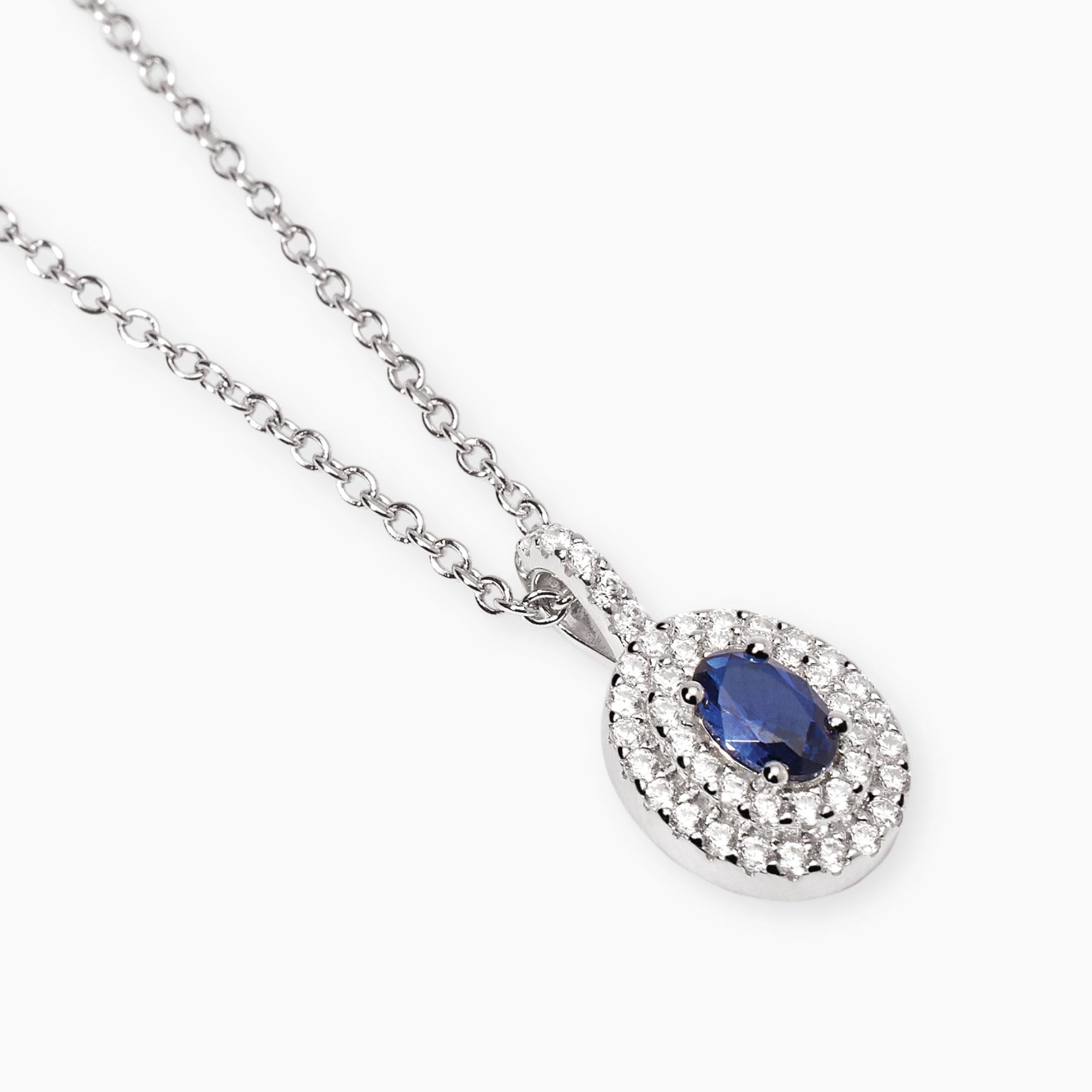 Girocollo in argento rodiato con catena rolò e ciondolo ovale in zaffiro sintetico e zirconi.