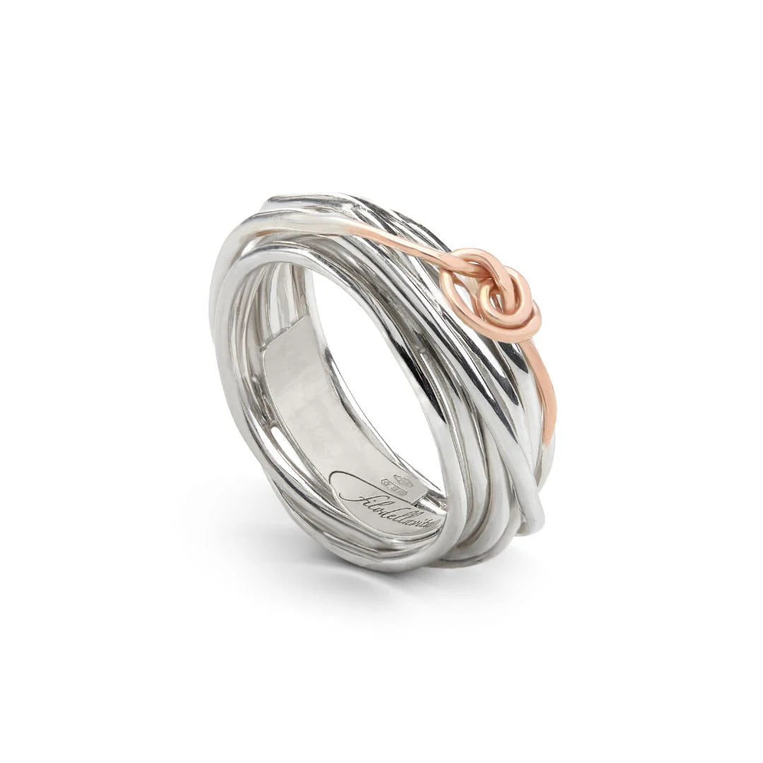 7 Fili in Argento 925 arricchito con Palladio, intrecciati a mano, incontrano l'iconico nodino di Filodamore in Oro Rosa 9kt.