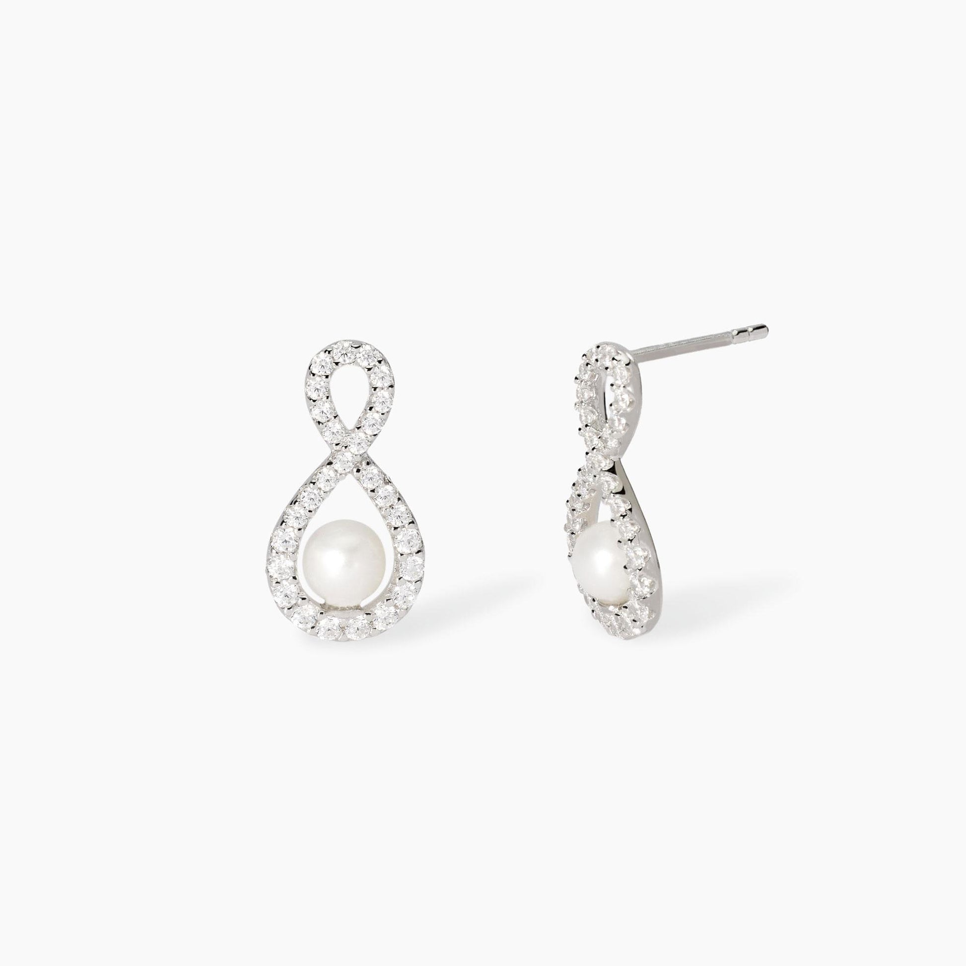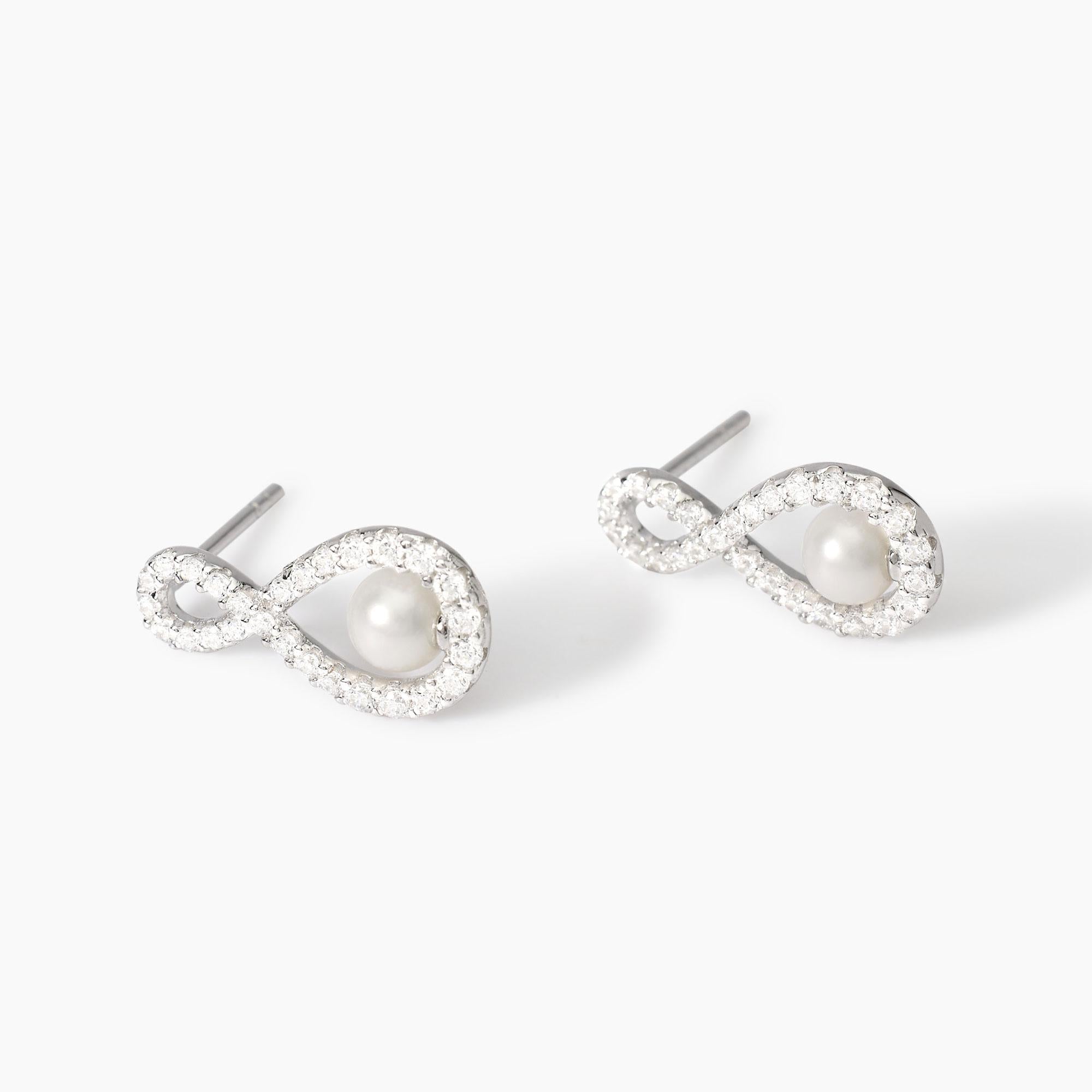 Orecchini in argento con forma infinito in zirconi e perle coltivate.