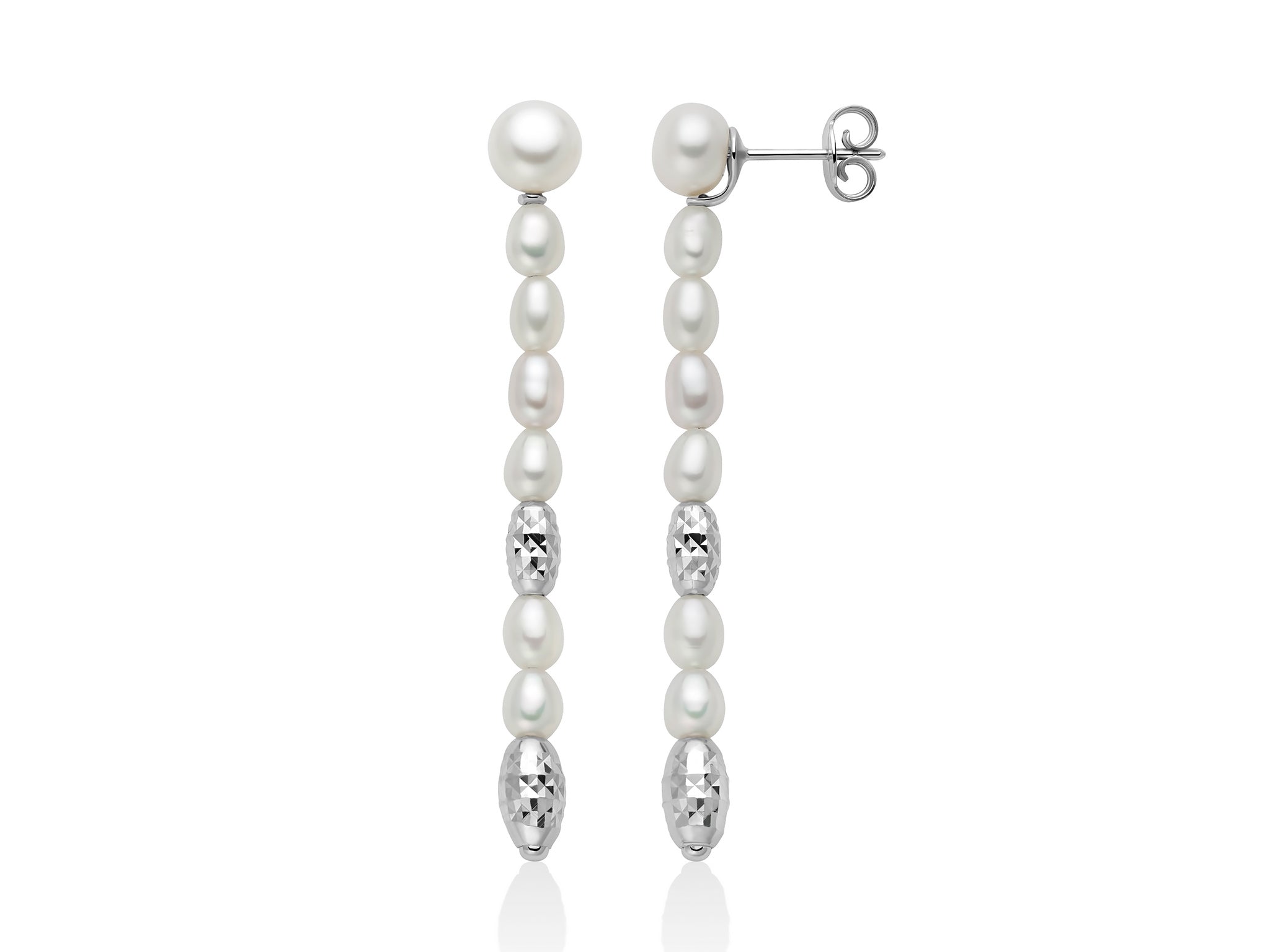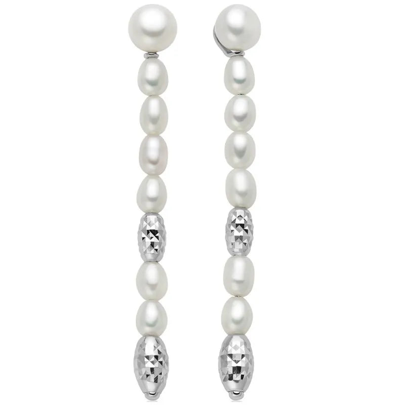 Orecchini pendenti di 5 cm con perle dalla forma allungata. La straordinaria luminosità delle perle è unita a elementi in argento diamantato per creare preziosi riflessi di luce.