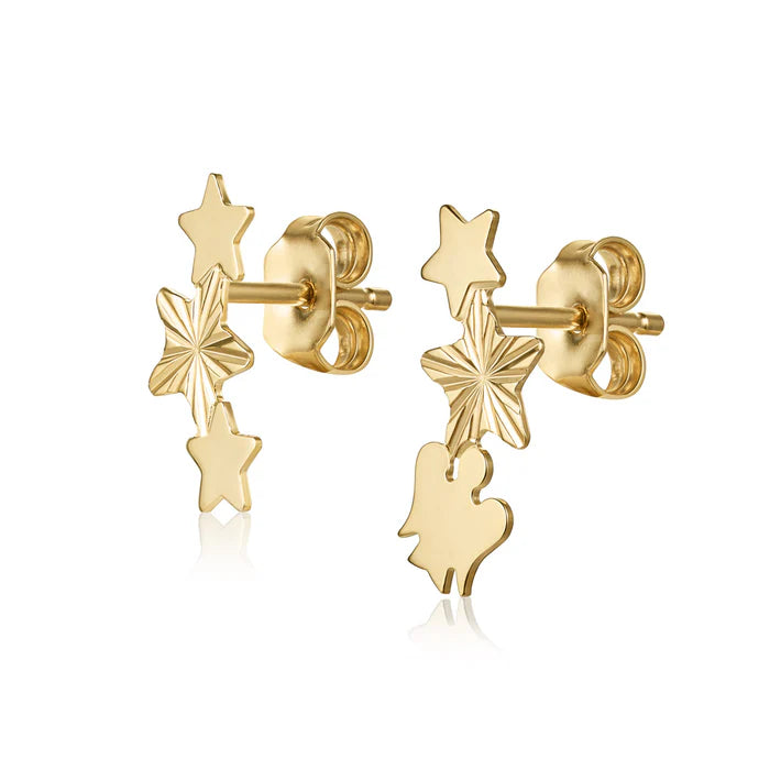 Questi incantevoli orecchini con stelle e angelo traforato, sono realizzati in oro 375/°°°. Ogni elemento racchiude il proprio significato simbolico: la stella diamantata cattura la luce, simboleggiando sogni e aspirazioni luminose, mentre l'angelo offre protezione e amore costante.