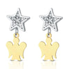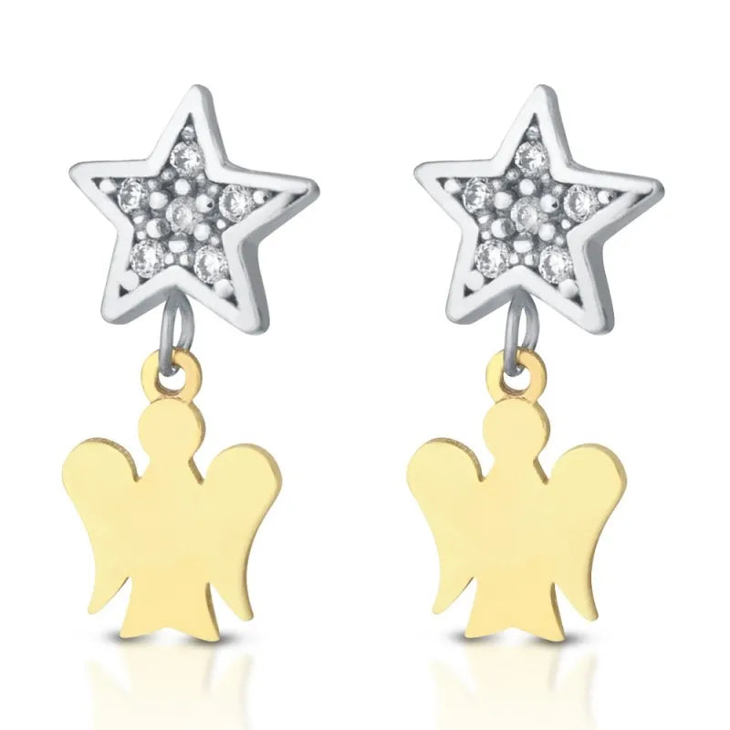 Orecchini Young con pendente angelo in oro giallo, stella in oro bianco e zirconi bianchi.