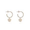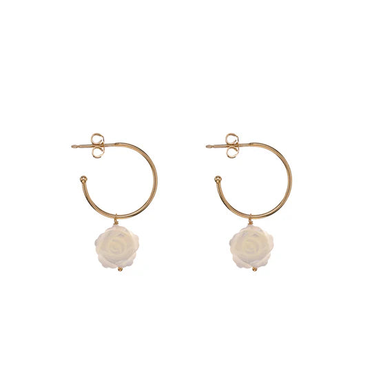 Eleganti orecchini a cerchio in argento 925, impreziositi da una rosa in madreperla pendente, per un movimento leggero e raffinato.
