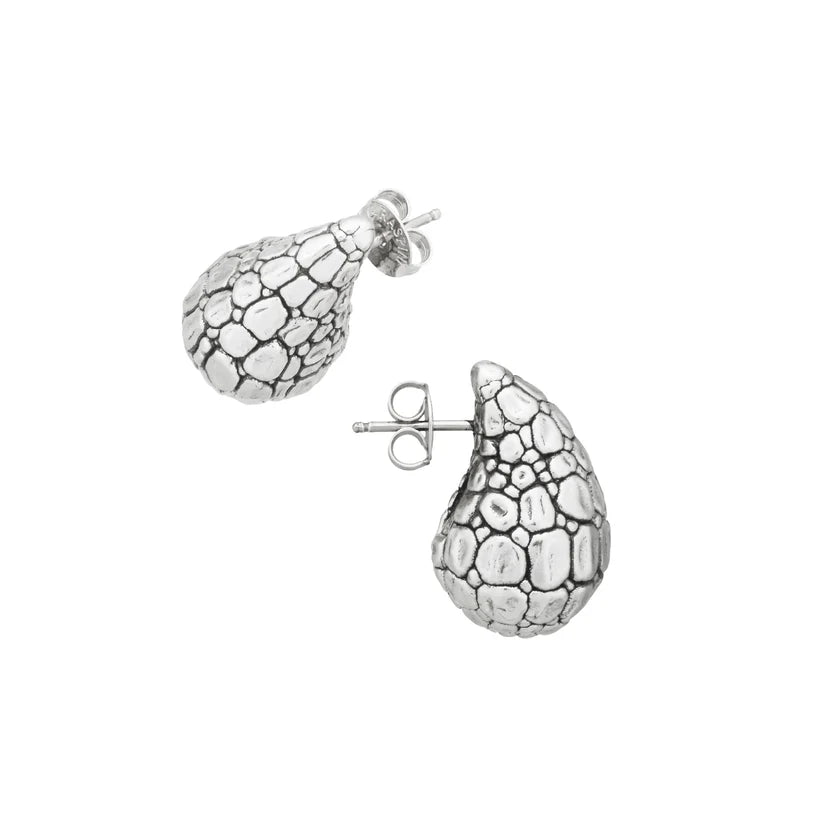 Orecchini a goccia della collezione Giovanni Raspini da donna. Colore: argento. Gli orecchini sono in argento 925‰ rodiato a forma di goccia con texture a coccodrillo. Chiusura a perno. I gioielli Giovanni Raspini sono interamente realizzati a mano in Italia.