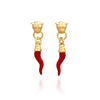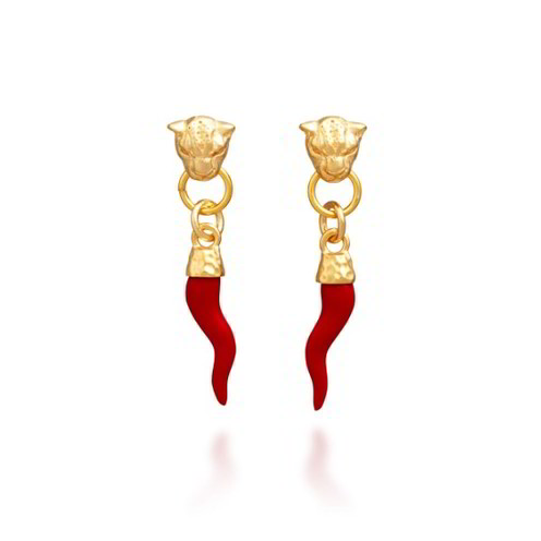 Questi nostri orecchini regalano luce, colore ed eleganza animalier. Due teste di leopardo, fuse in argento a cera persa e quindi dorate, sostengono ognuna un cornino rosso in resina ecologica. Realizzati competamente a mano in azienda.