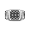 Anello a scudo Zancan in Argento 925. L'anello è caretterizzato da un texture striata che ne ripercorrono i fianchi ed è tempestato di lucenti spinelli neri sulla parte superiore.