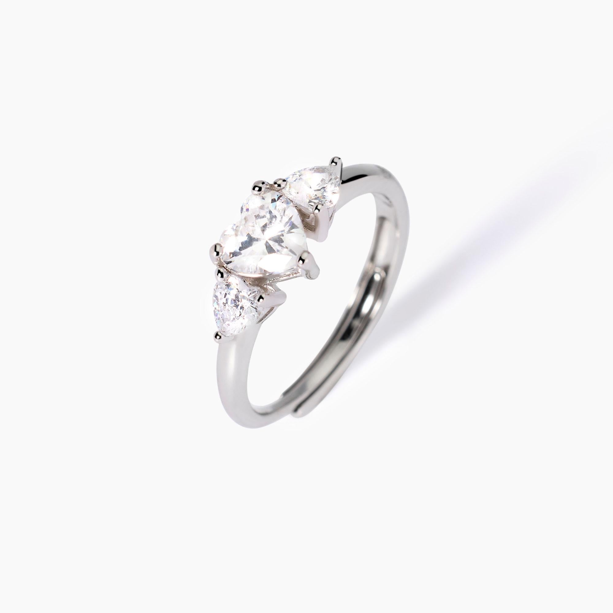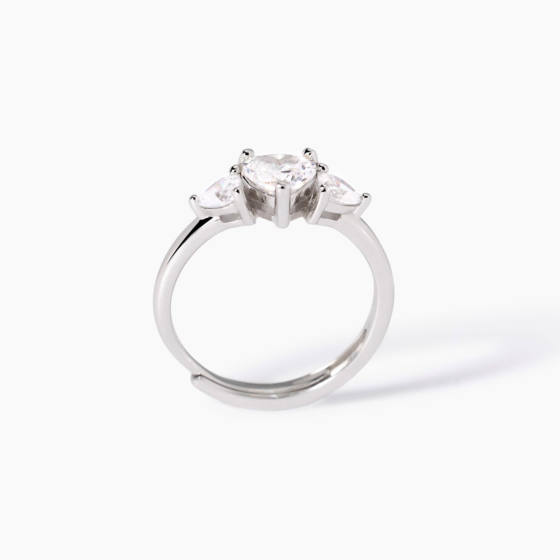 Anello regolabile da donna in argento rodiato con zirconi taglio cuore.