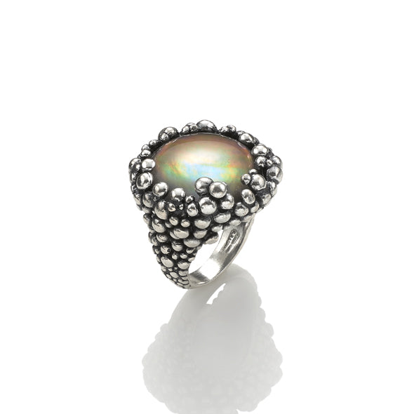 Una grande madreperla doppiata con quarzo e incastonata tra sferette d'argento brunito è la protagonista di questo affascinante anello. Riflessi opalescenti rosa e verdi, grigi e cilestrino caratterizzano la Collezione Maui, ispirata ai colori dell'alba riflessi sul grande oceano.