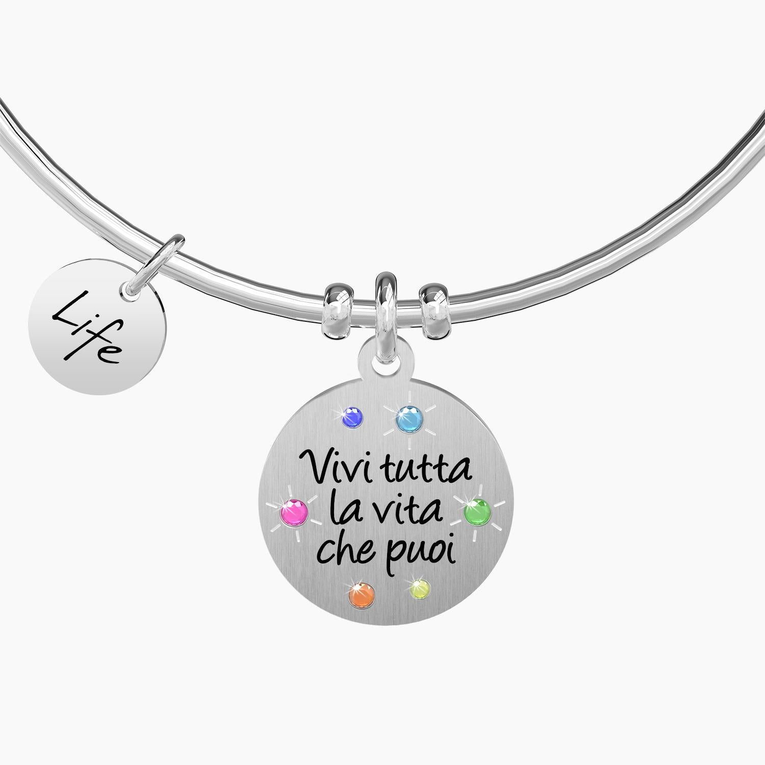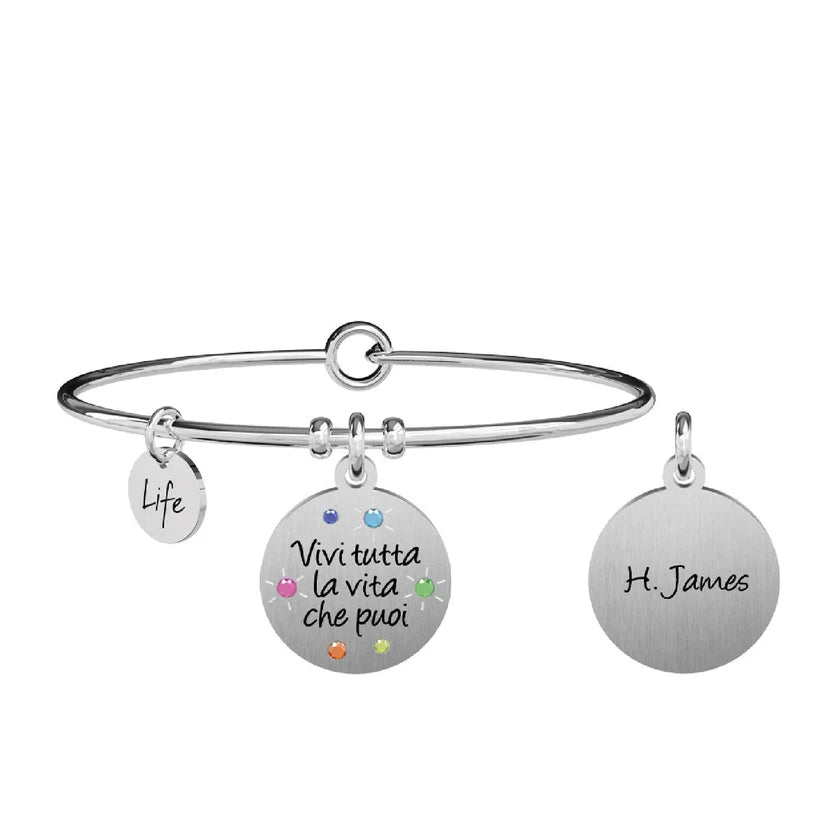 Bangle in acciaio con ciondolo satinato tondo con cristalli colorati e scritta di Henry James "Vivi tutta la vita che puoi".
