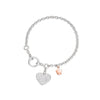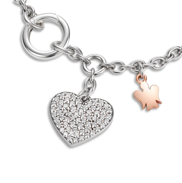Bracciale con chiusura ad anello, cuore charm in argento, zirconi bianchi e angelo in argento rosato.