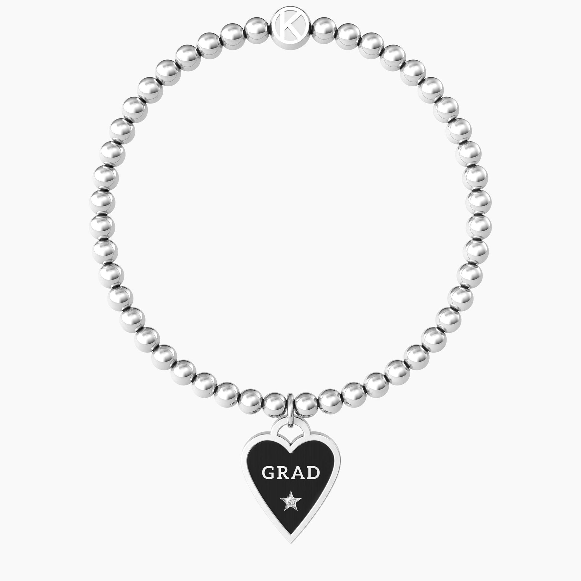 Bracciale elastico con sfere in acciaio e ciondolo satinato nero a forma di cuore con cristallo e scritta "Grad".