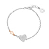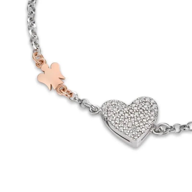 Bracciale con pendente doppio cuore in argento, zirconi bianchi e angelo in argento rosato.