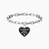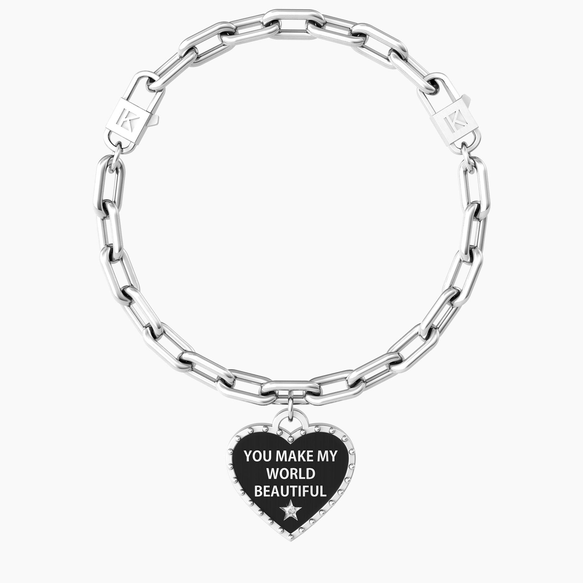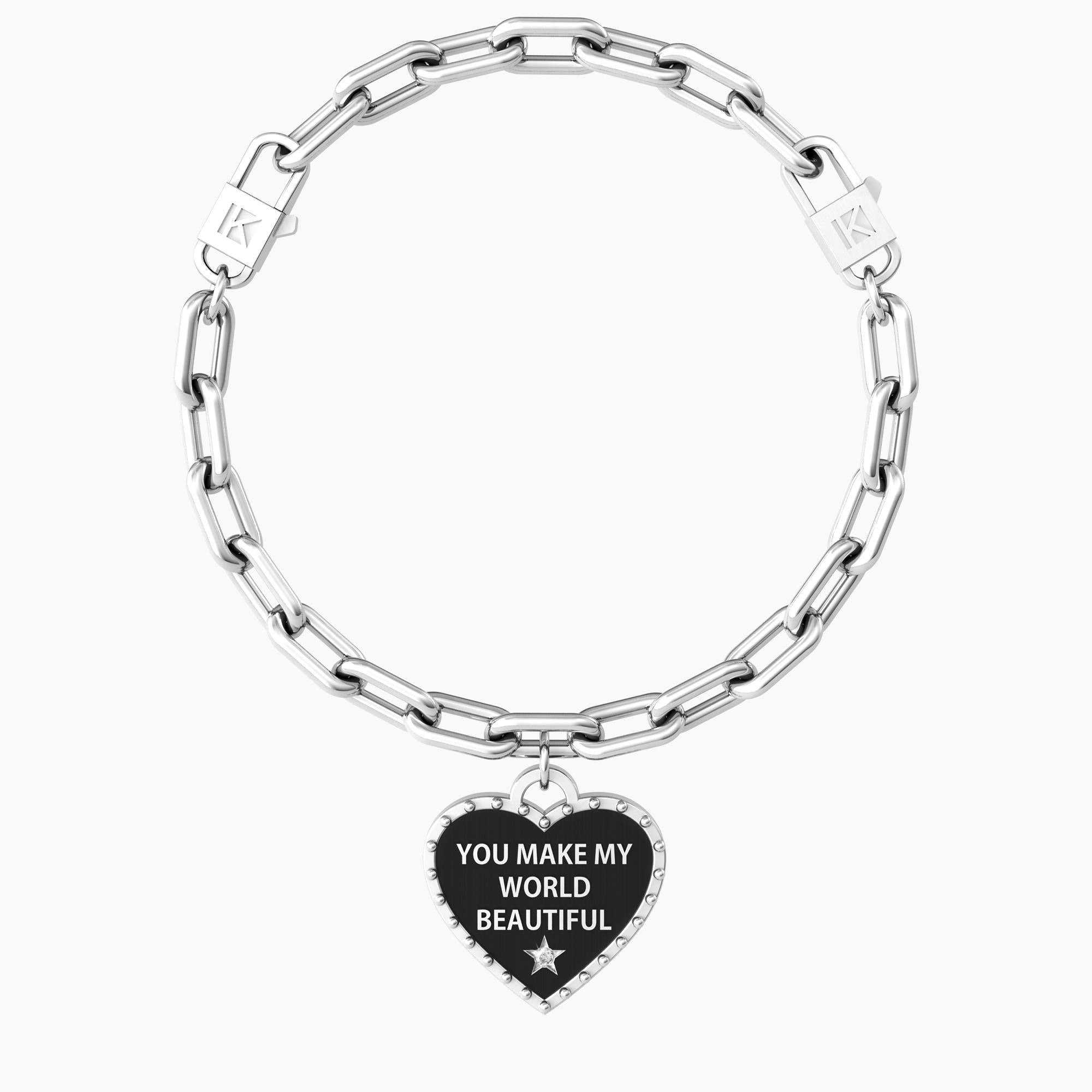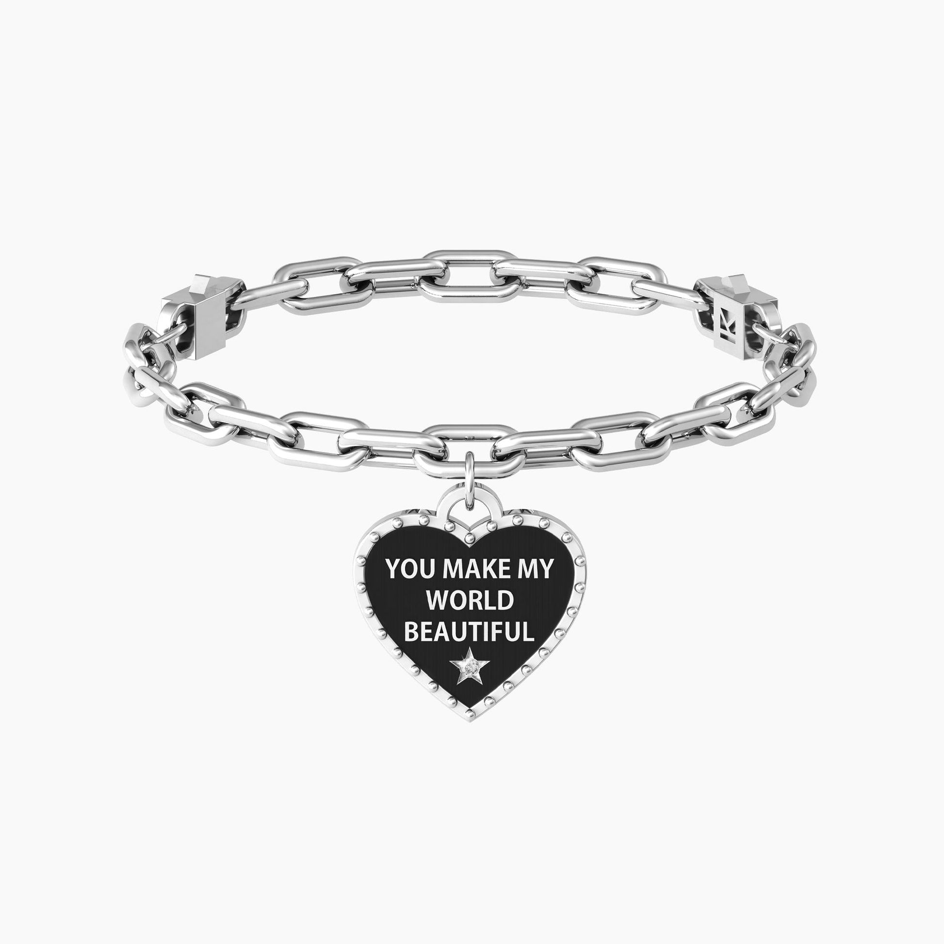 Bracciale in acciaio "Comfort fit" con catena a maglie ovali e ciondolo nero satinato a forma di cuore con rifinitura borchiata, cristallo e scritta "You make my world beautiful".