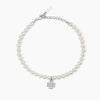 Bracciale perle conchiglia in argento con ciondolo a forma di quadrifoglio in pavé di zirconi.