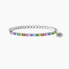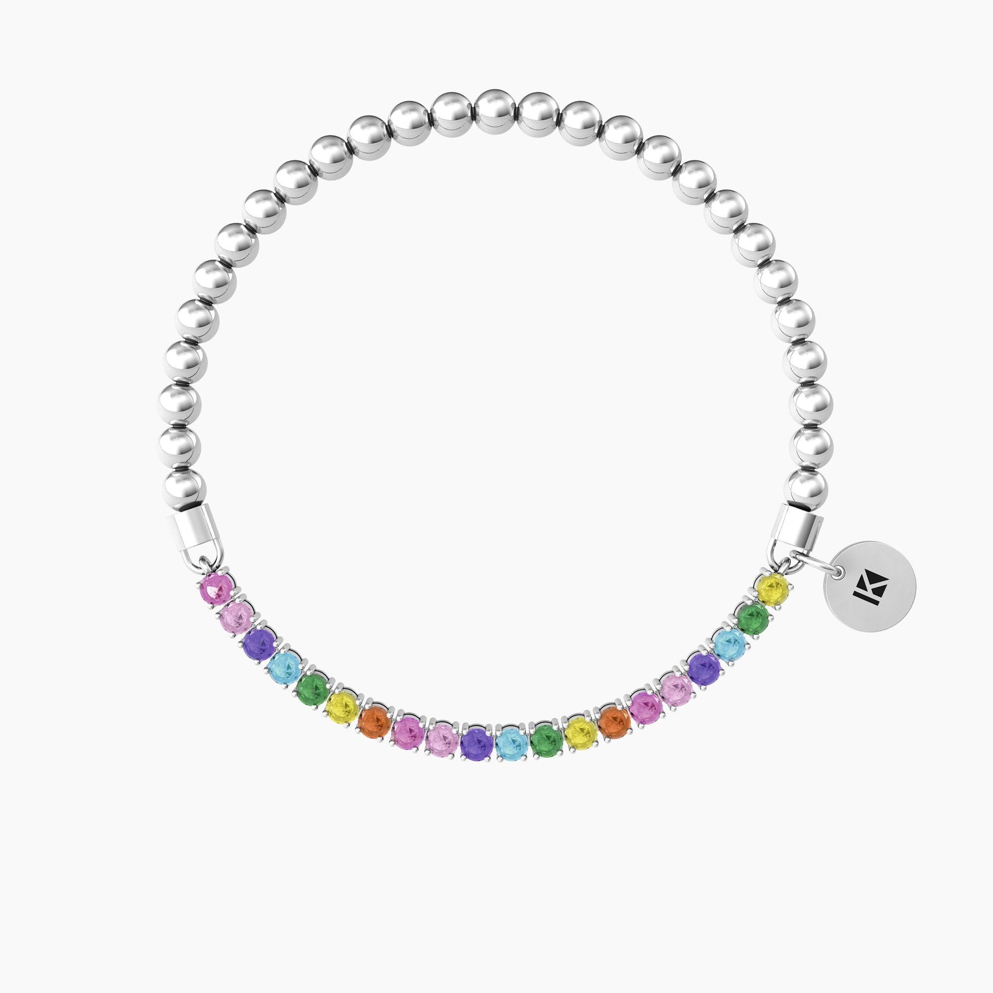 Bracciale elastico in acciaio con sfere lucide e tennis di zirconi multicolor.