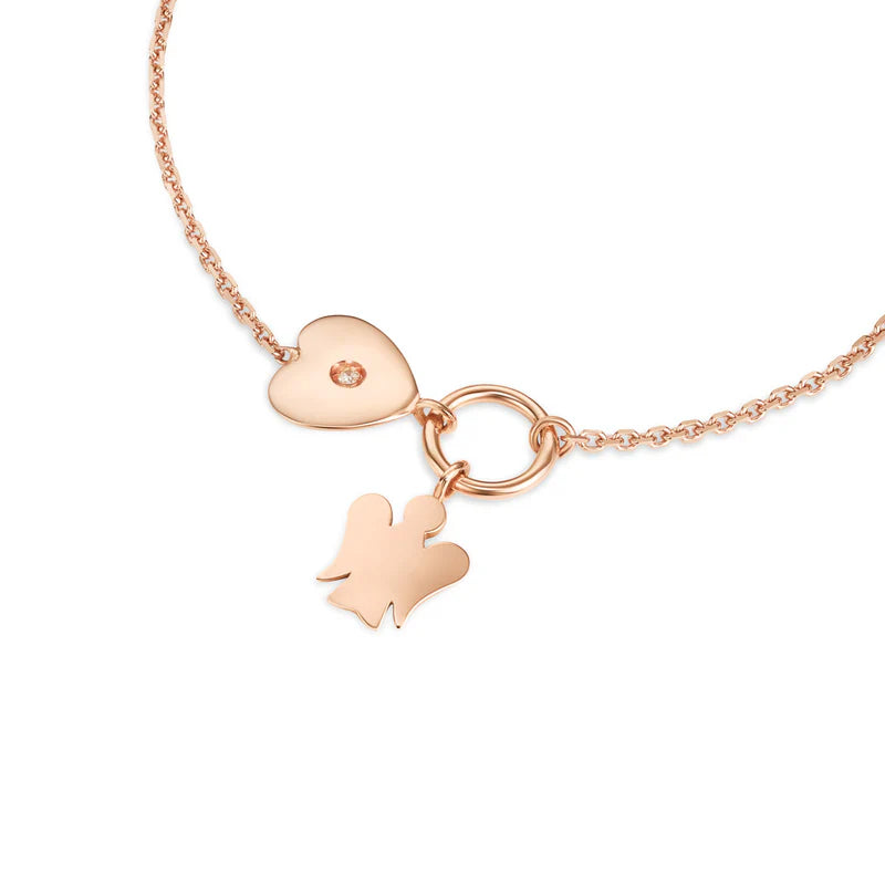 Il bracciale in oro rosa con angelo e diamante è un gioiello unico, femminile, sofisticato. In una parola, essenziale. O meglio, Essential.