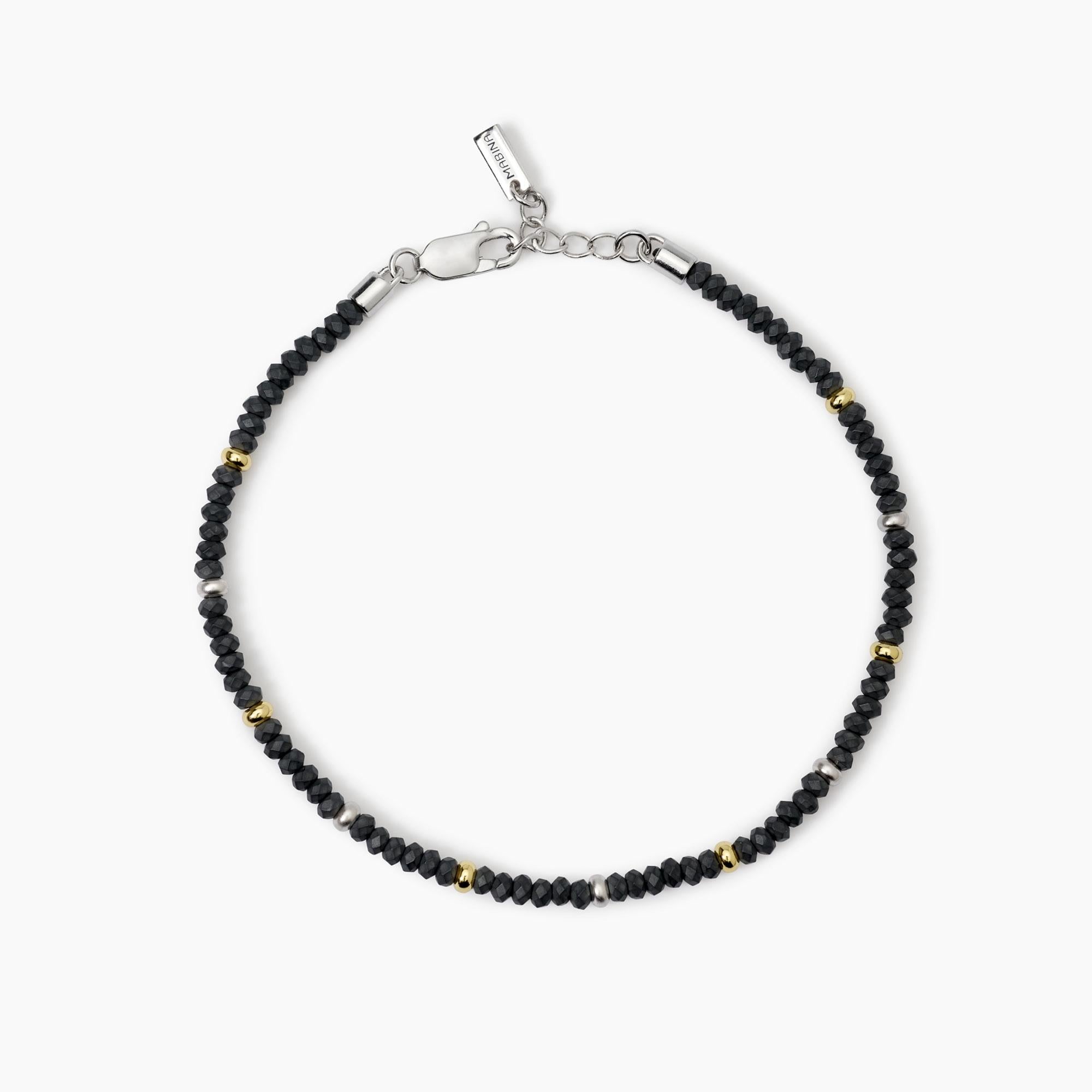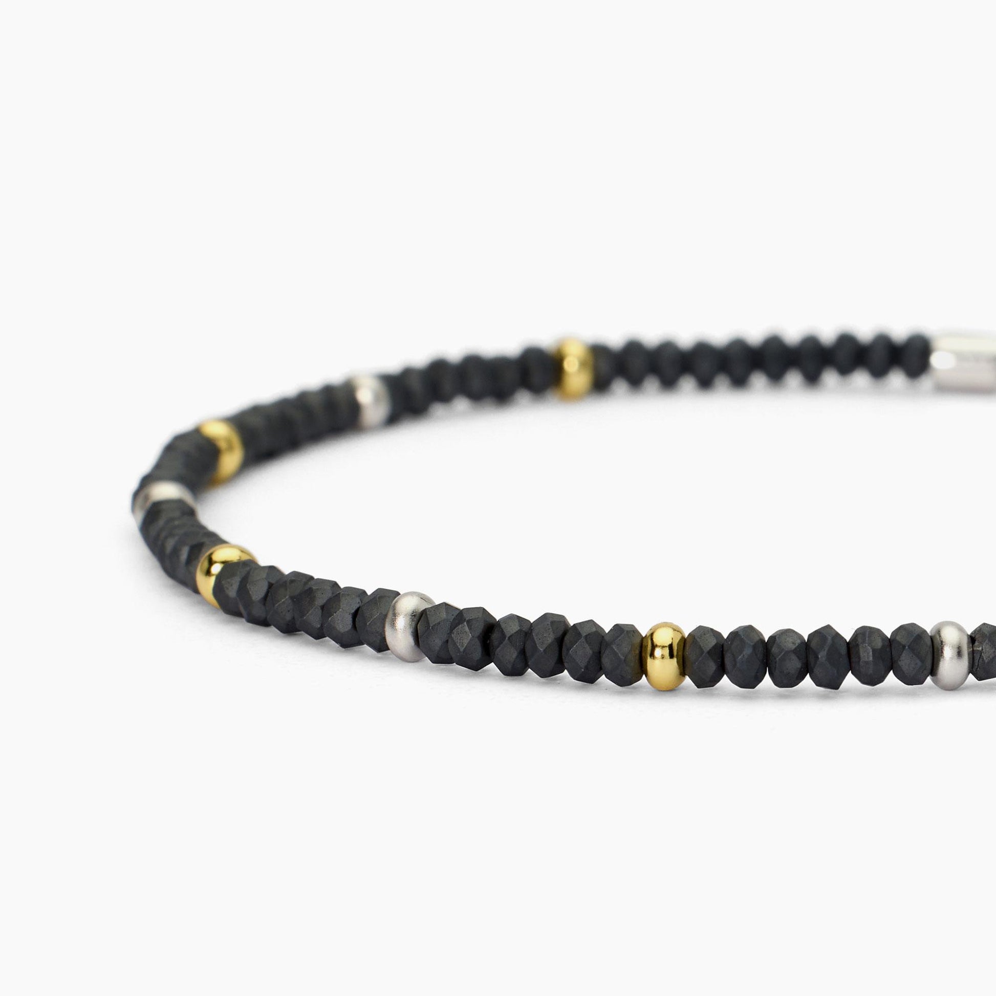 Bracciale da uomo regolabile in argento rodiato con rondelle sfaccettate di ematite e inserti placcati oro giallo.