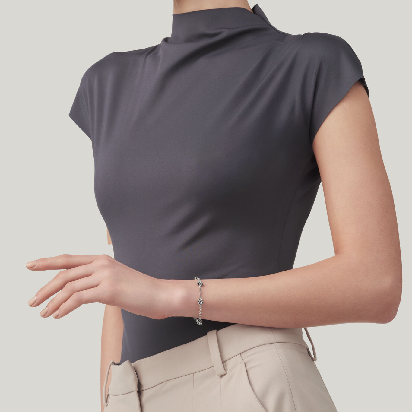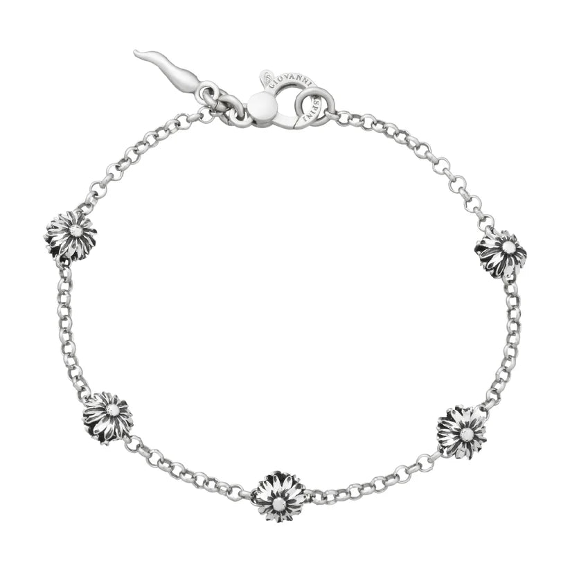 Il decoro naturalistico che caratterizza i gioielli Giovanni Raspini si fa piccolo e minimale. In questo bracciale in argento, la margherita, diamantata a mano petalo per petalo, va ad abbracciare in modo ritmato la catena mini-rolò del bracciale. Un gioiello che emana luce assoluta ad ogni indosso. Realizzato a mano in azienda.