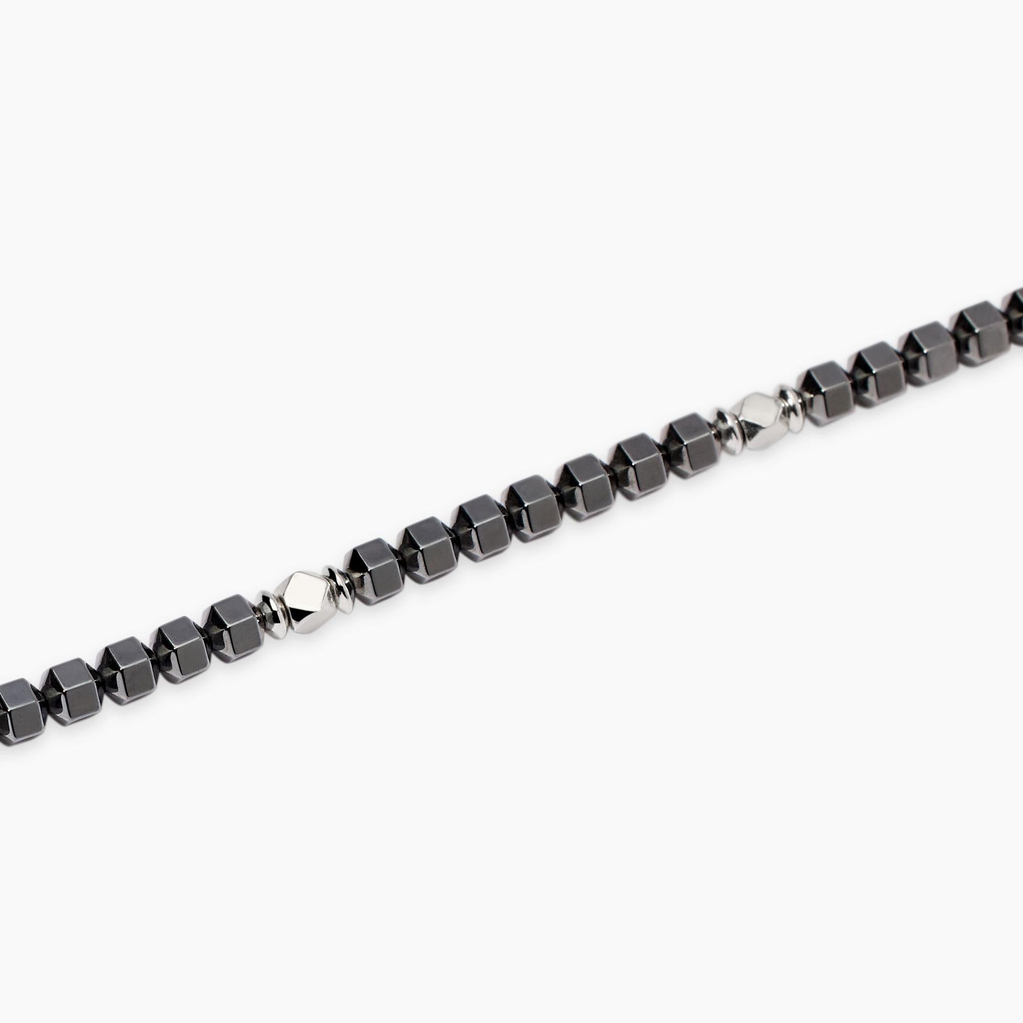 Bracciale regolabile con dischetti e cubetti faccettati in argento rodiato e ematite faccettata esagonale.