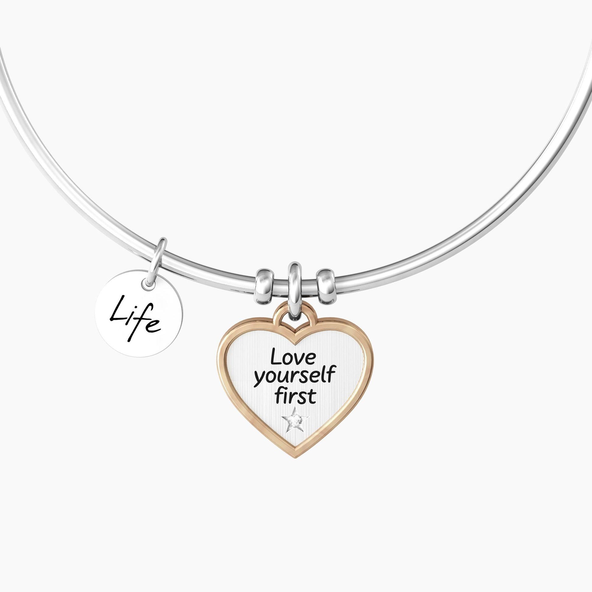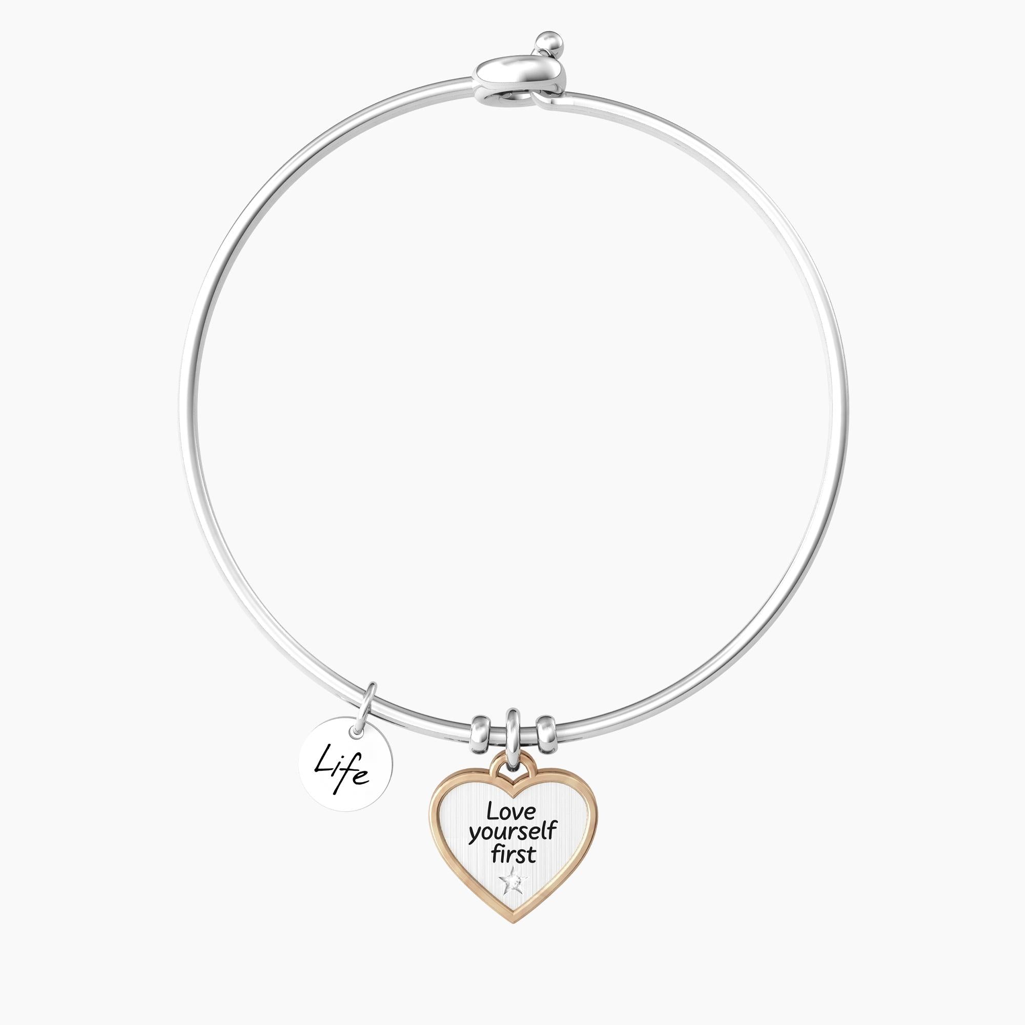 Bangle in acciaio con ciondolo cuore satinato e rifinitura a contrasto color oro rosa. Incisione smaltata "Love yourself first" con dettaglio punto luce a forma di stella. Chiusura del bracciale tonda.