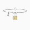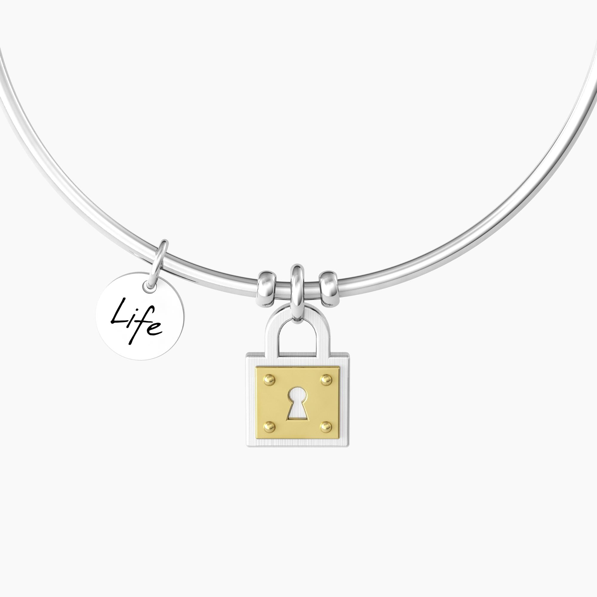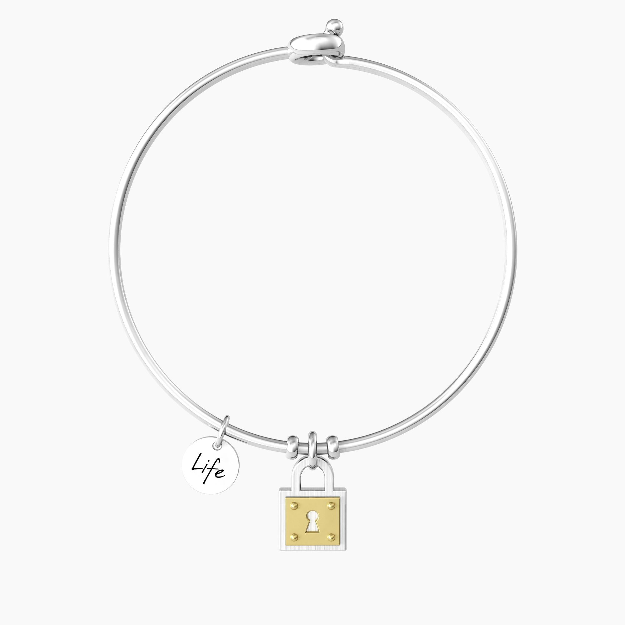 Bangle in acciaio con ciondolo lucchetto. Dettaglio color oro sul fronte e frase "Best friends" smaltata con punto luce sul retro. Chiusura del bracciale tonda.