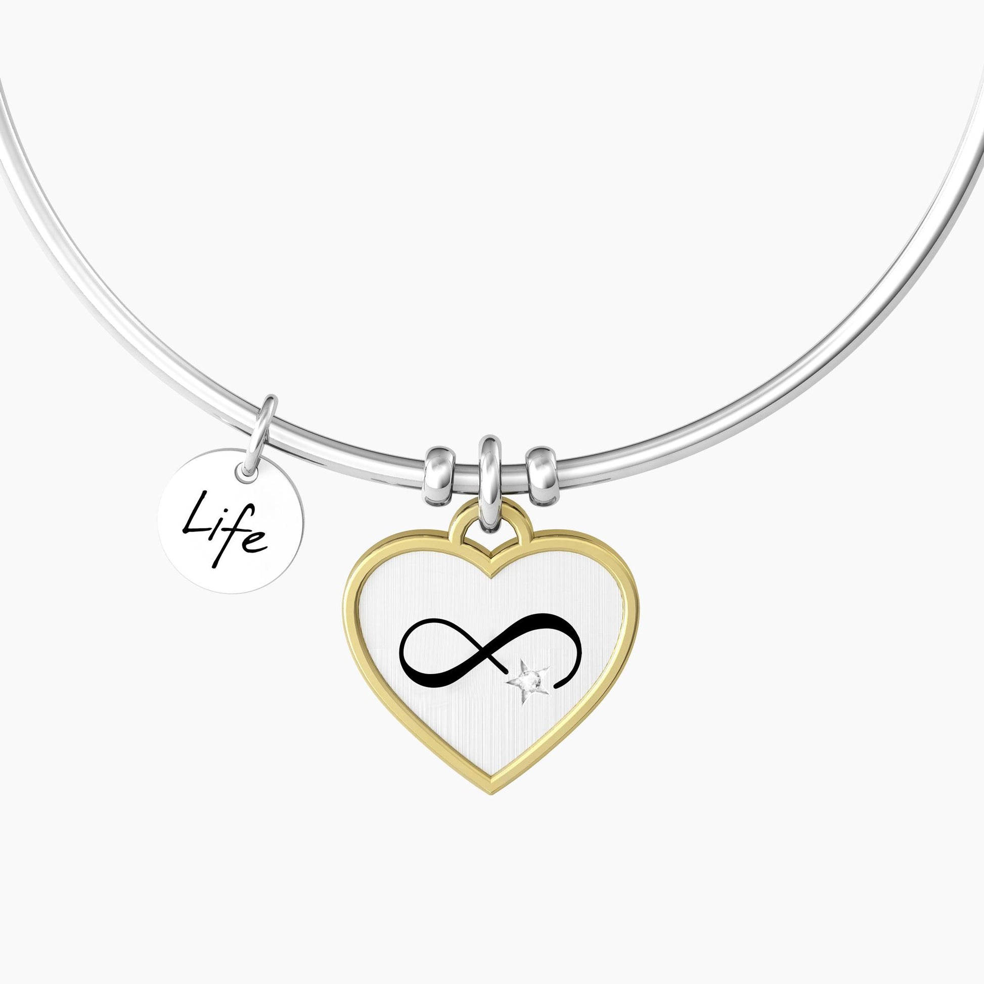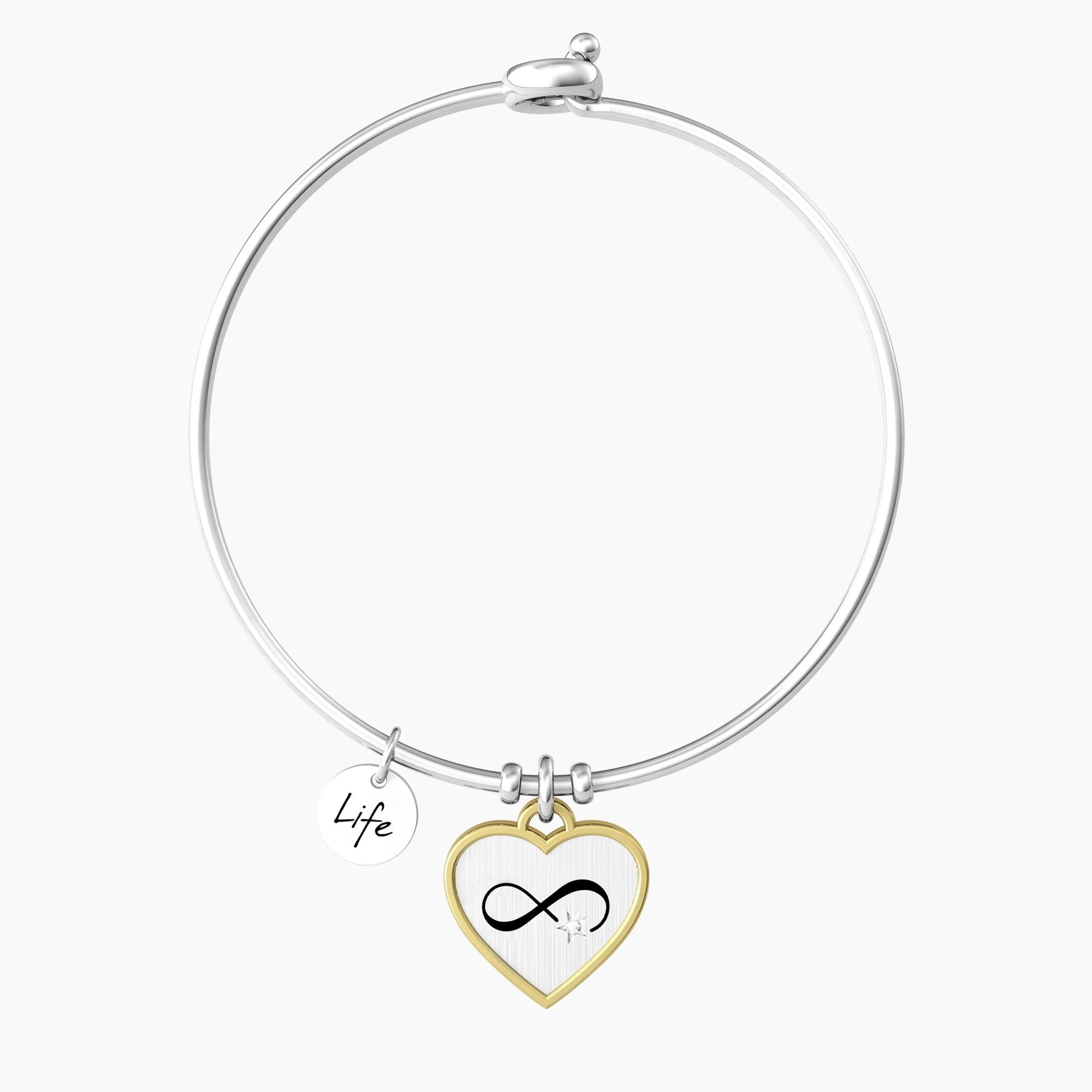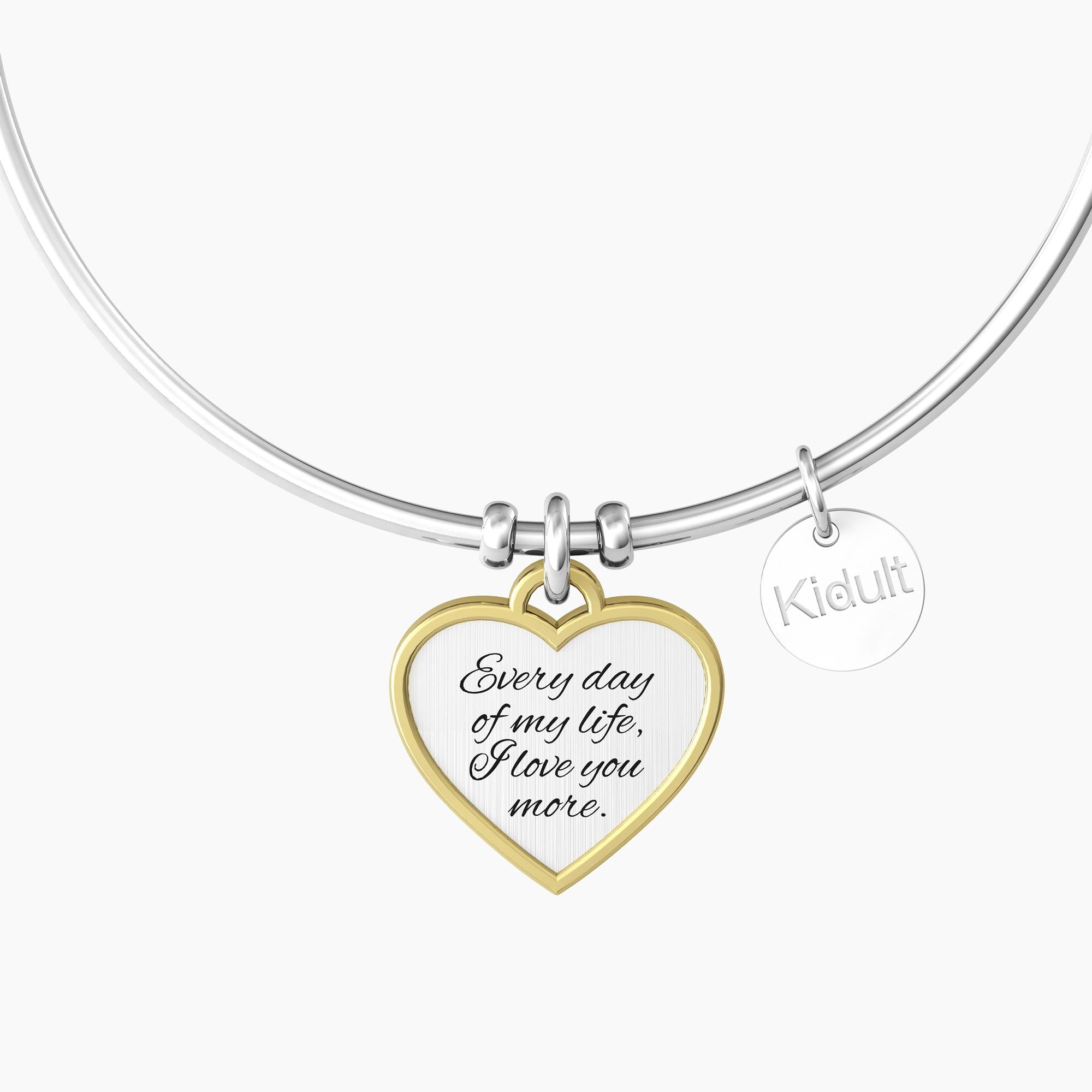 Bangle in acciaio con ciondolo cuore in acciaio satinato e rifinitura a contrasto in color oro. Simbolo dell'Infinito con punto luce sul fronte e incisione con frase "Every day of my life I love you more" smaltata sul retro. Chiusura del bracciale tonda.