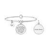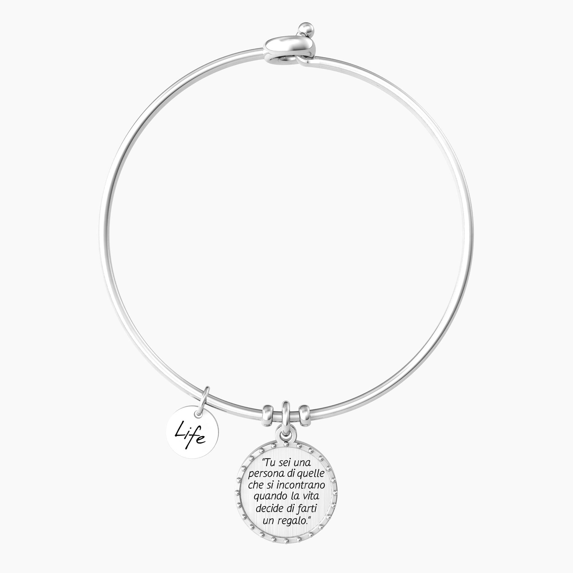 Bangle con ciondolo tondo in acciaio satinato e bordo lucido borchiato con frase di Charles Dickens: "Tu sei una persona di quelle che si incontrano quando la vita decide di farti un regalo".