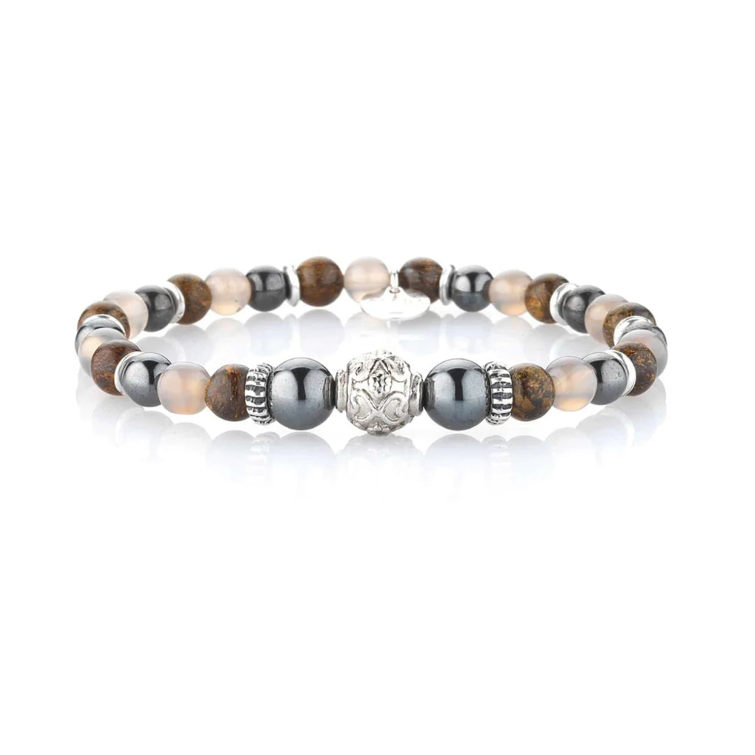 Bracciale Williams con filo elastico, realizzato a mano con Ematite, Bronzite, Agata e componenti in Argento 925. Questo bracciale è il regalo perfetto per il tuo partner, adatto ad ogni occasione, come un compleanno o per San Valentino. Emblema di bellezza, eleganza e raffinatezza. L’Ematite è conosciuta anche come “pietra del sangue” perché durante la sua lavorazione la polvere che si forma è di colore rosso. Già ai tempi dei babilonesi veniva utilizzata per la stimolazione dei globuli rossi. Aiuta a concentrarsi e rafforza la voglia di vivere e a guardare ai problemi con una maggior concretezza, portandoci a analizzare le questioni in un’ottica meno ansiogena. La bronzite è una pietra dall’intero colore bronzo , viene utilizzata soprattutto per armonizzare lo spirito. Viene chiamata anche la “pietra della cortesia” perché va a mitigare rabbia e aggressività. Allevia le tensioni sia fisiche che mentali. In questo modo vi aiuta non solo ad affrontare i periodi di stress, ma migliora anche la lucidità mentale necessaria per saper fronteggiare le difficoltà. L'Agata invece non promuove l’azione, ma l’introspezione. E’ quindi eccellente per coloro che tendono ad agire d’impulso senza riflettere troppo. I componenti in argento sono anallergici, con il valore inciso come prova di autenticità oltre alla lucentezza che gli dona. Il design è moderno e minimalista, da usare sia quotidianamente che in particolari occasioni.