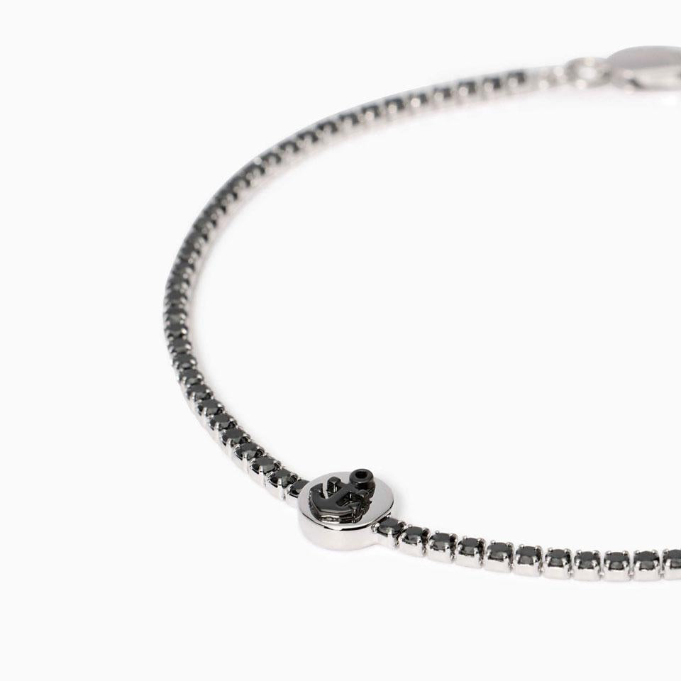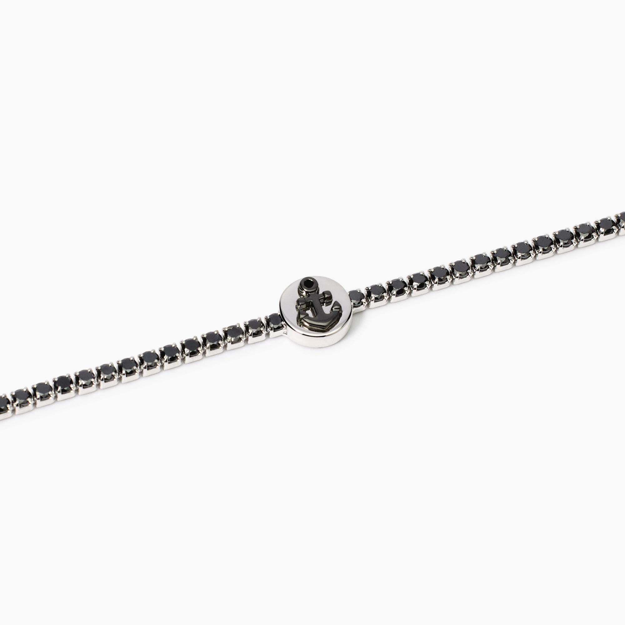 Bracciale in argento rodiato con tennis in zirconi con elemento centrale simbolo ancora in argento brunito.