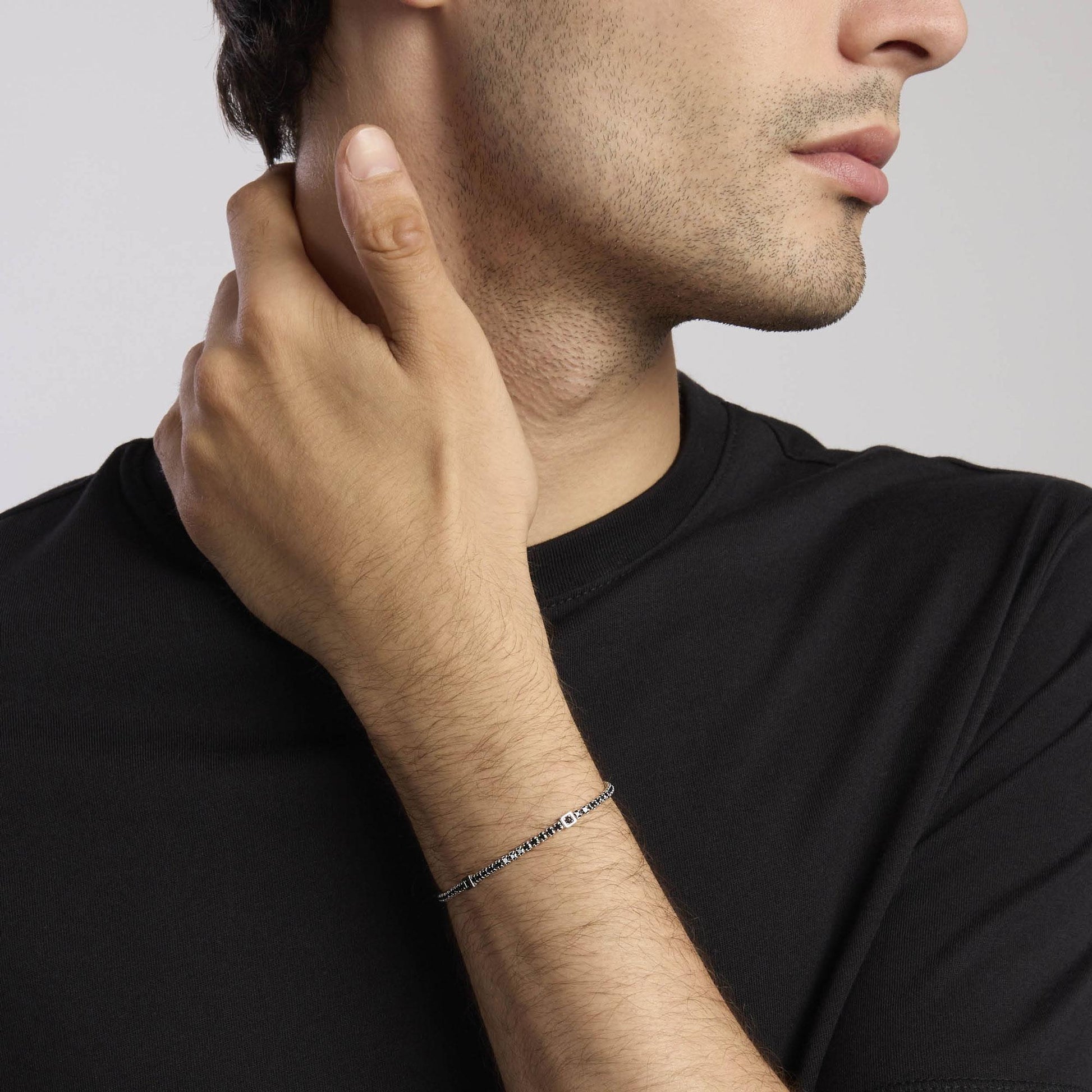 Bracciale tennis uomo regolabile in argento rodiato con inserti quadrati in zirconi neri.
