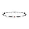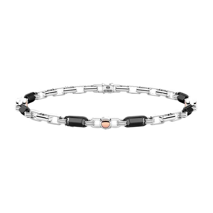 Bracciale da Uomo della Marca Zancan collezione Union. Il bracciale è realizzato in Argento 925. Raffigura un maglia ad anelli rettangolari alternati alle maglie in ceramica nera con lavorazione lucida. Sulle maglie sono presenti sei piccoli bottoni in Oro giallo 18 KT dal peso di 0.28 gr. La lunghezza della catena è di 21 cm regolabile fino a 18 cm grazie agli anelletti di regolazione. La chiusura è con maglia a moschettone.