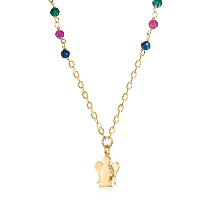La collana con pendente angelo in oro e pietre colorate di Roberto Giannotti è un gioiello interamente in oro, reso particolare e vivace dalle pietre colorate e dal pendente angelo dalle linee semplici ed eleganti.
