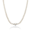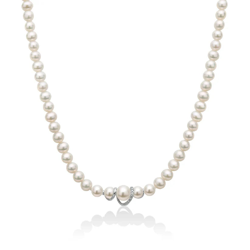 Una collana di perle elegante e sinuosa, caratterizzata da perle Oriente con diametro 5-5,5 mm e una decorazione centrale in oro bianco e diamante che avvolge le perle con movimento a spirale.