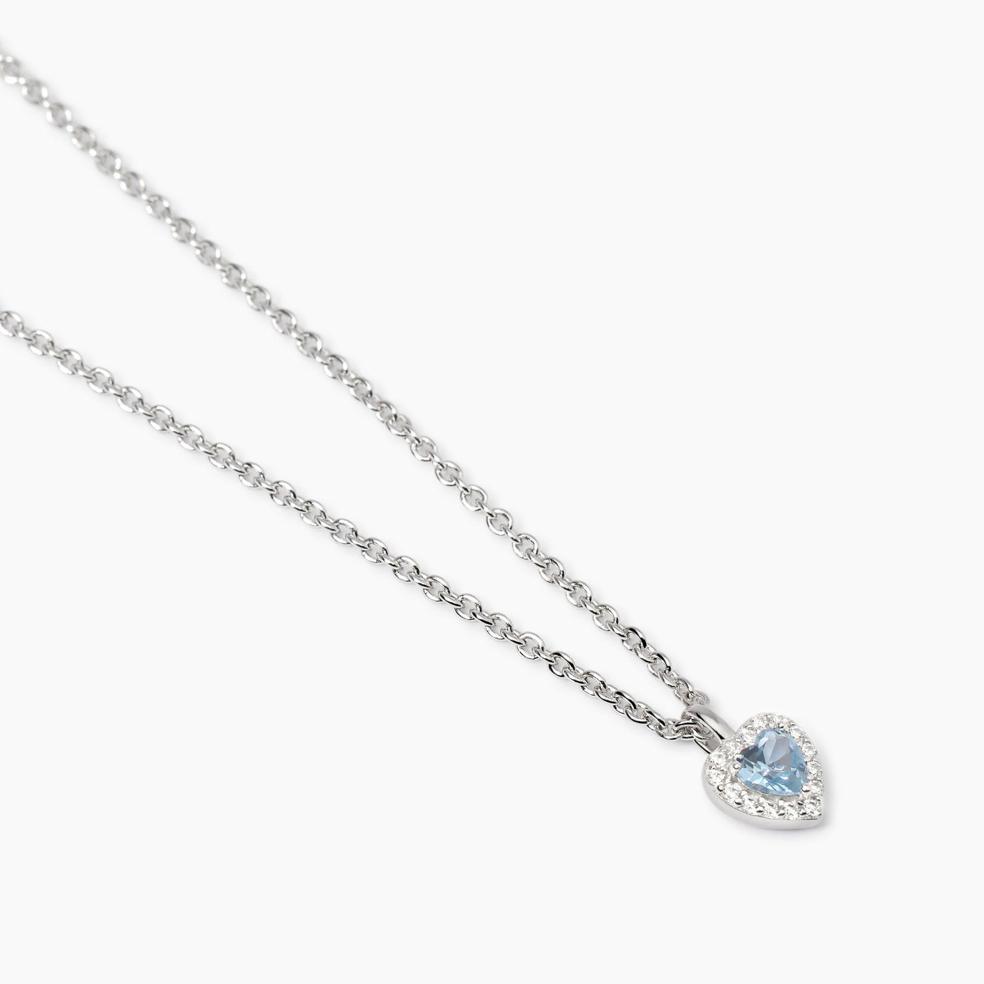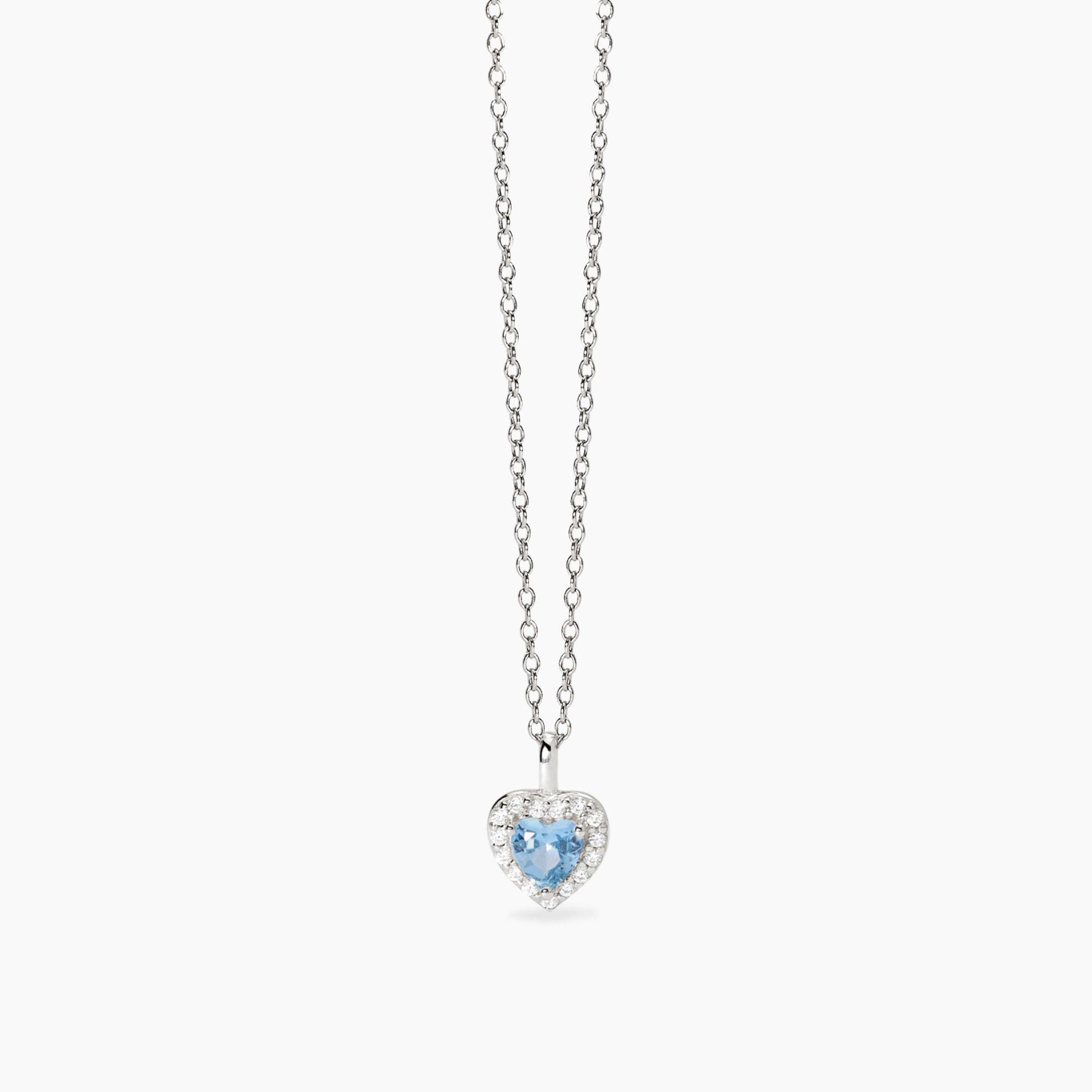 Girocollo in argento con catena rolò con ciondolo cuore in zirconi bianchi e acquamarina sintetica.
