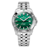 Nereide Malachite combina eleganza naturale e prestazioni subacquee con un quadrante in autentica malachite, riconoscibile per le sue uniche striature verdi. La cassa in acciaio 316L, abbinata a una lunetta in tungsteno inscalfibile, offre resistenza e affidabilità. Il design è completato dal bracciale Sansovino, con maglie lucide e satinate, dotato di una chiusura con micro-regolazione per garantire una vestibilità ideale.