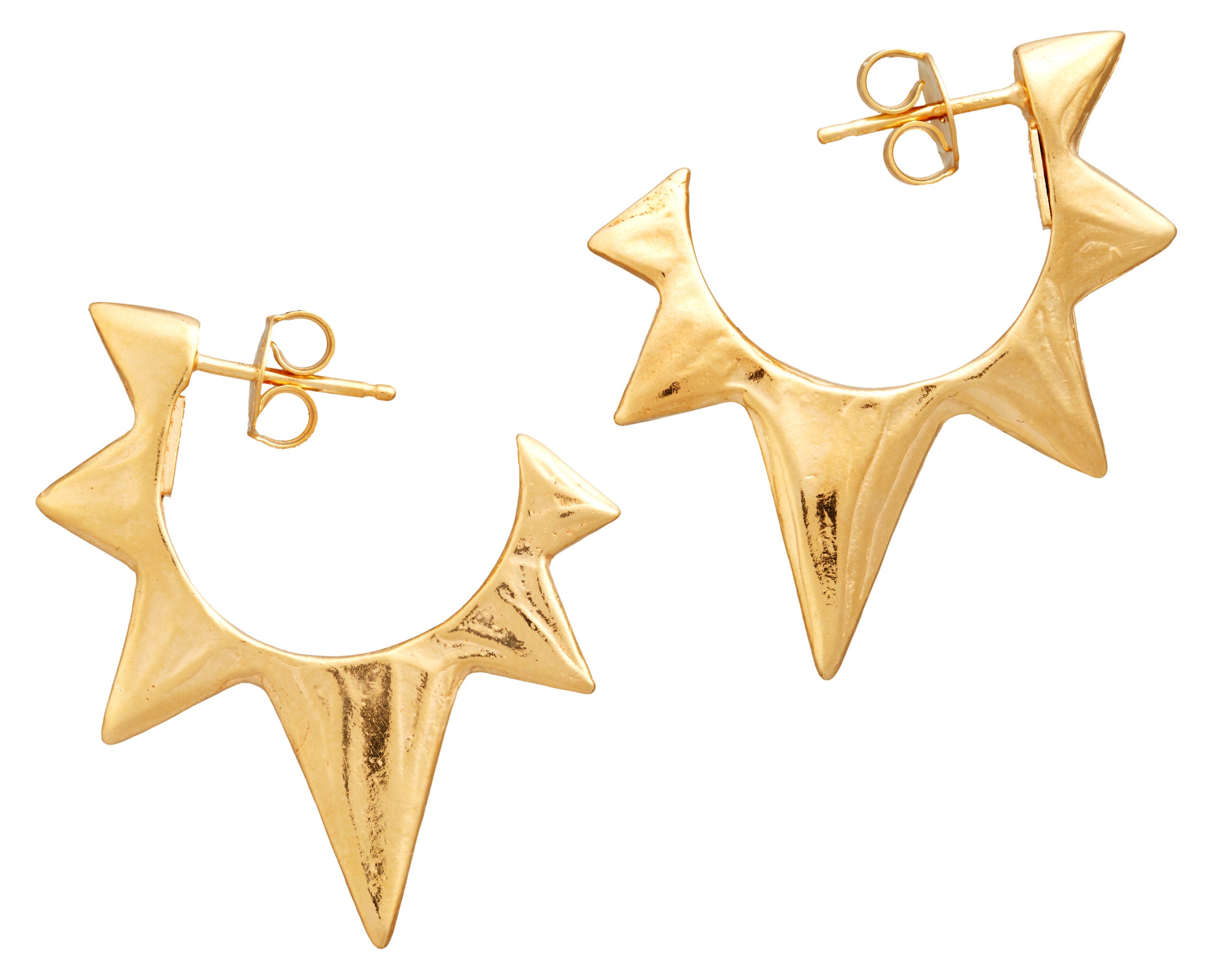 Gli orecchini Rock Star in argento dorato propongono una superficie spatolata a mano e bordi in forma di cuspidi. Modernissimi e particolari, vengono realizzati interamente a mano con l'antica tecnica della fusione a cera persa.