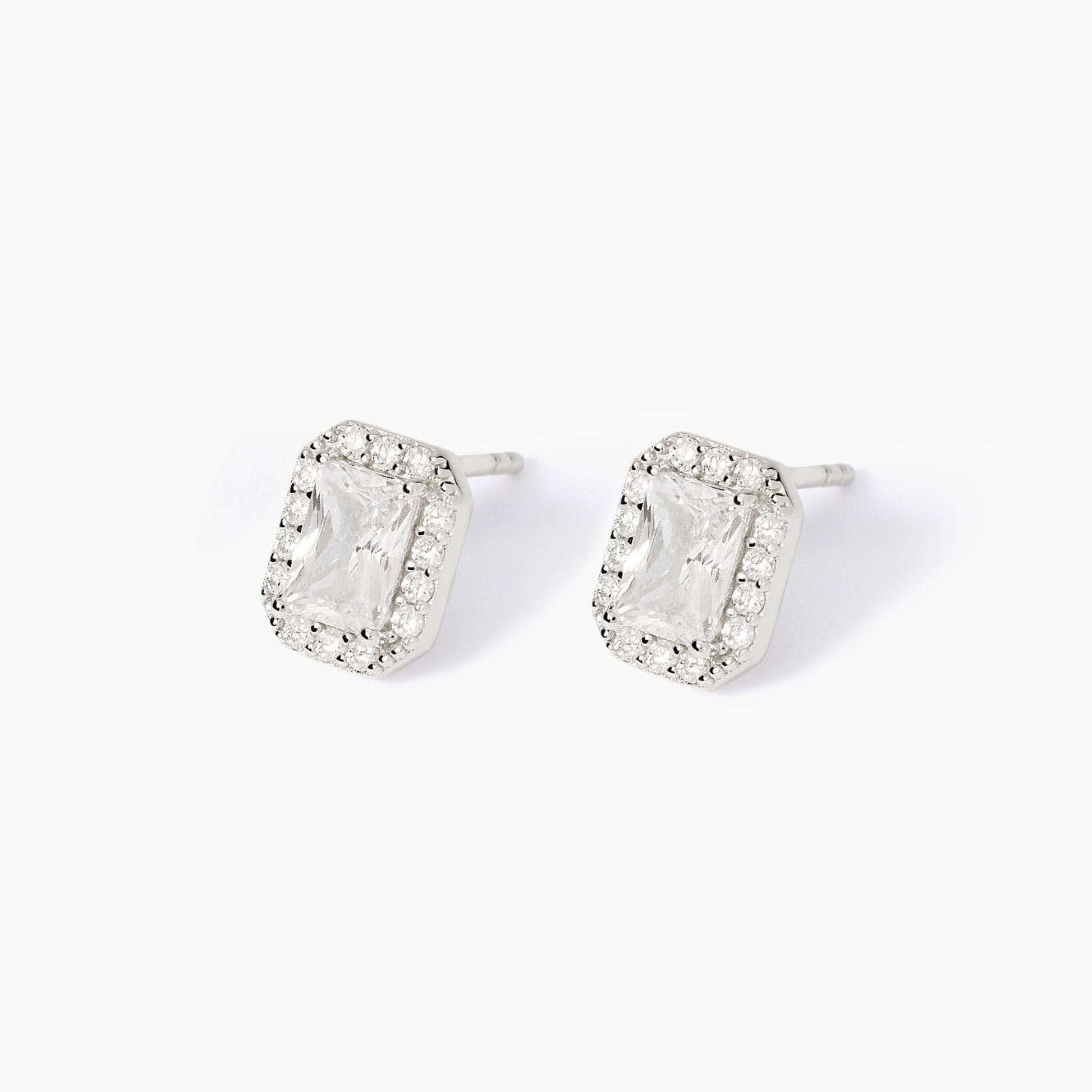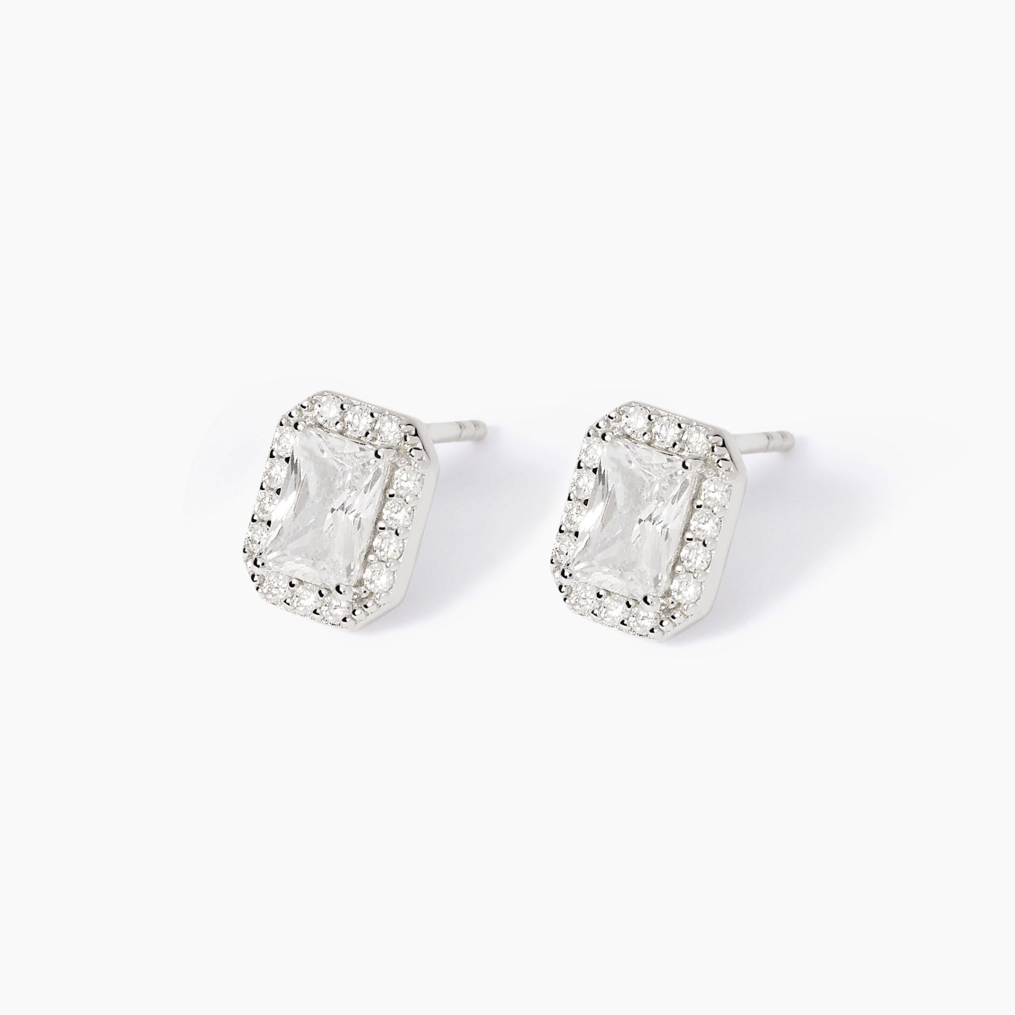 Orecchini a lobo da donna in argento rodiato con zircone taglio ottagonale e zirconi bianchi.